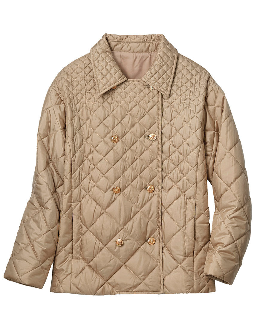 中わた入りダイヤ柄キルト素材で今風な軽快さにアレンジした大人感あるピーコート中わたにサーモライトRを使用。裾から上に向って細かくなるおしゃれなダイヤ柄キルトに金色の釦がアクセントです。LOVE BODY 2023冬号 P13-1に掲載されています。サーモライトRはThe LYCRA Companyの登録商標です