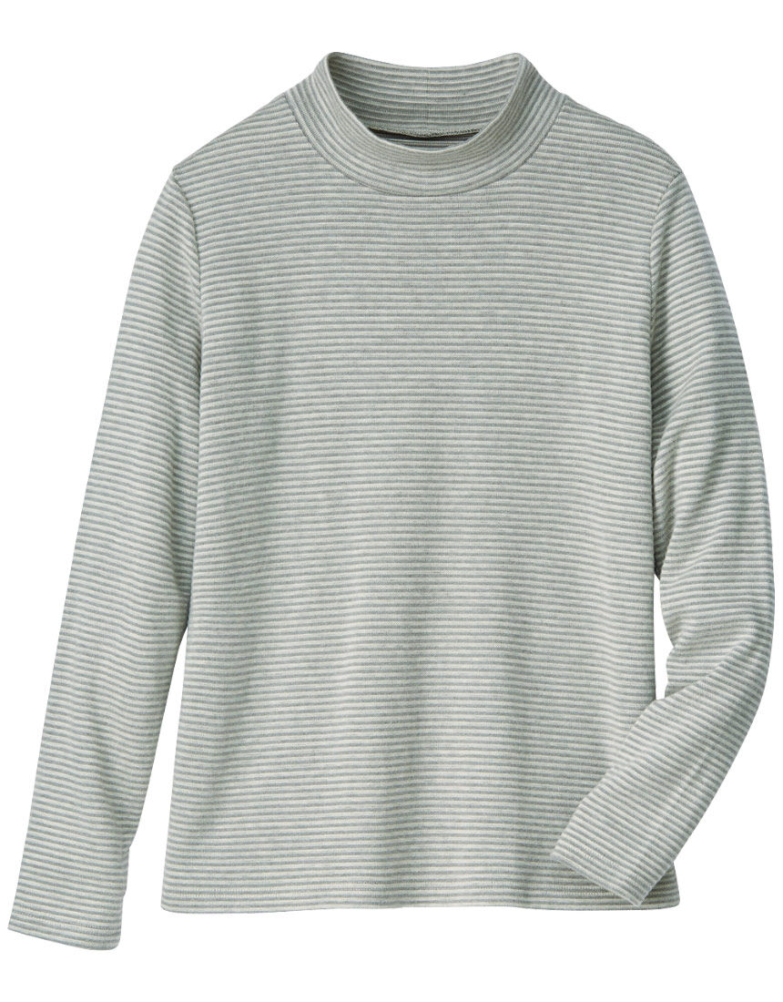 微起毛感が冬らしいカットソーであったかやわらかな風合いで首もとをやさしく包むハイネック。装いを明るく演出する色合いの着やすい細ボーダーです。LOVE BODY 2023冬号ゆららP11-2に掲載されています。