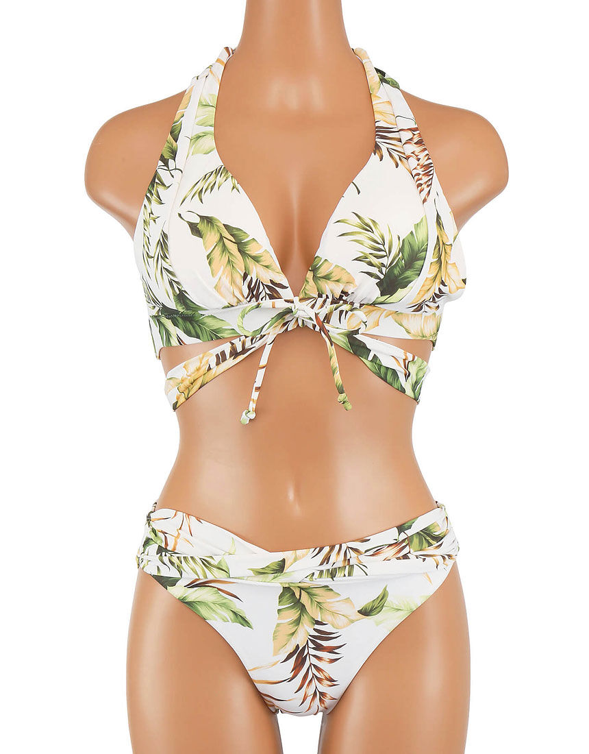大胆なリーフプリントは、華やかさと柔らかい雰囲気をミックスさせたカラーリングがポイントです。ブラ内側のパットが自然なボリュームを作り出しバストラインがスッキリ見えする人気のデザインです。ノンワイヤーなので締め付けずノンストレスでバストにボリュームを作ってくれます。ブラの背中にはアジャスターがついているのでアンダーの調節も可能。シンプルでいてオシャレなボリュームアップビキニはオススメの水着です。