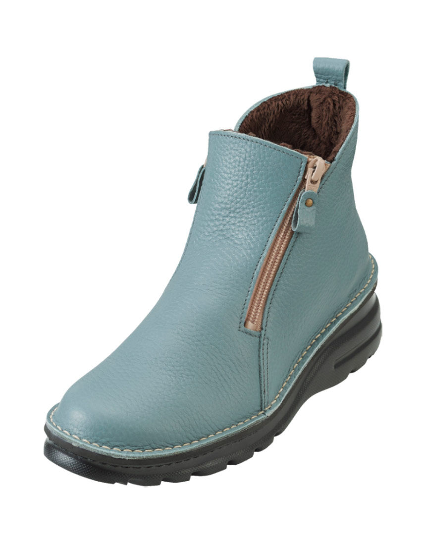 LOVE BODYセレクション Lui e lei毛足の長いふんわり裏ボアで足もとにぬくもり脱ぎ履きしやすい4Eのショートブーツ足なじみのよいソフトな牛革。カジュアルなアクセントを兼ねたダブルファスナー仕様です。LOVE BODY 2023冬号 P21-1に掲載されています。