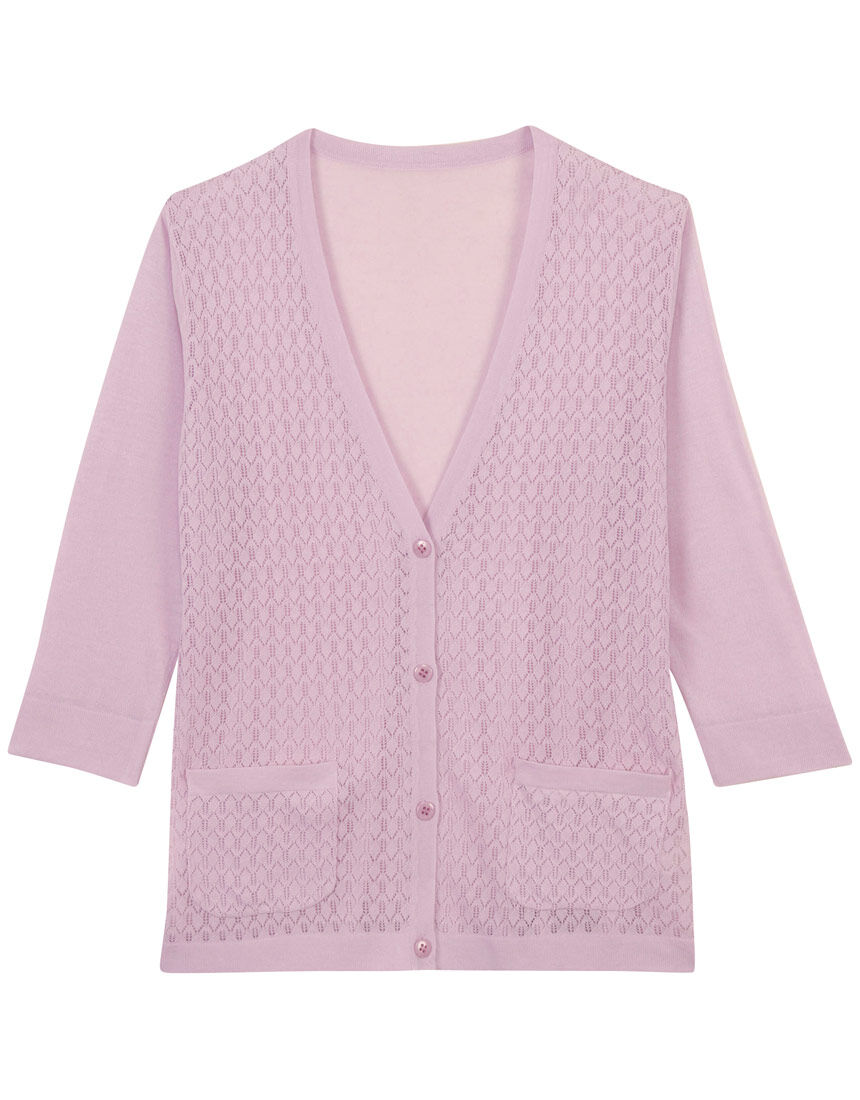 前部分の透かし模様が涼しげなカーディガン。※前ポケット付き【サイズ詳細】※身長154cm?162cmに対応しています。M:バスト104.0cm、着丈63.0cm、肩幅40.0cm、袖丈42.0cm L:バスト110.0cm、着丈63.0cm、肩幅41.0cm、袖丈42.5cm※でき上がり寸法を表示しています。※サイズ詳細の寸法には多少の差異がございます。出来上がり寸法の測り方についてはこちら