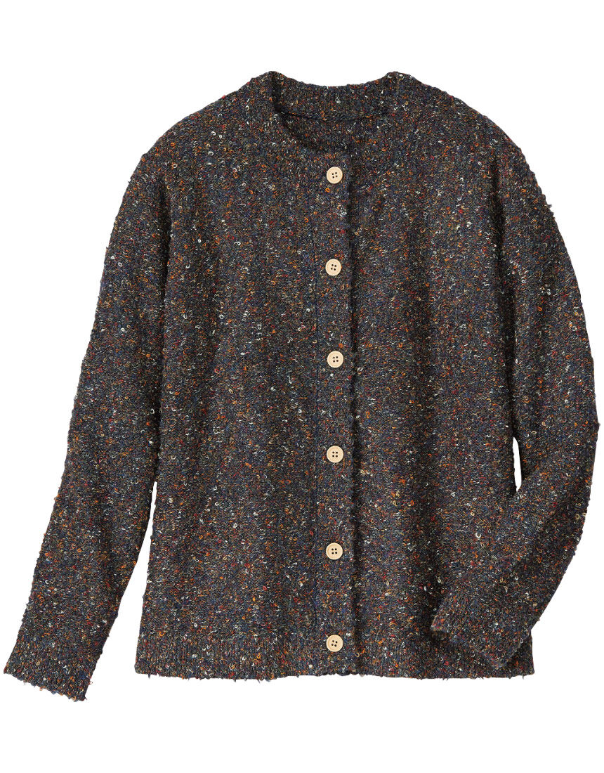 表情豊かなやわらかカーディガンふわっと編んだ多彩なリング糸の色合いを楽しむシンプルなデザイン。木調の釦がアクセントです。LOVE BODY 2023冬号ゆららP17-1に掲載されています。