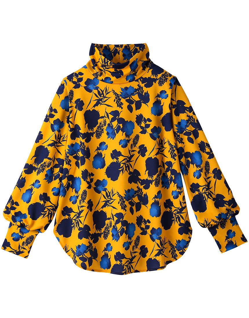 トップス長袖・カフス付き・大人の体型を考え、体型をカバーしてくれる設計のきれいめブラウス、「Tブラウス」・デコルテ、首が隠れるタートルネック・アームホールはゆとりを持たせた設計で動きも快適。・裾広がりのAラインシルエットで体型カバー。・袖はバルーンスリーブにカフス付き。 裾はラウンドデザインで前身頃をインできるデザイン。・ヒップが隠れる丈設定。 BU・BLはランダムなドット柄プリント、SP・YEは陰影を加えたフラワー柄プリント。【サイズ詳細】※身長154?162cmに対応しています。M?L:バスト108.0cm、肩幅37.0cm、着丈69.5cm、袖丈64.0cm※袖丈は袖口カフス込みで表示しています。※着丈は後中心丈です。※出来上がり寸法を表示しております。※サイズ詳細の寸法には多少の差異がございます。出来上がり寸法の測り方についてはこちら
