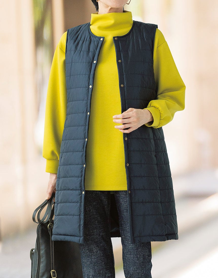 薄くてもあったか機能わた中わたにシンサレート™を使用。表地は撥水性のあるタフタ素材で薄くかろやかに仕上げたシンプルなロング丈ベストです。LOVE BODY 2023冬号 P122-3に掲載されています。3M シンサレート™は3M社の商標です