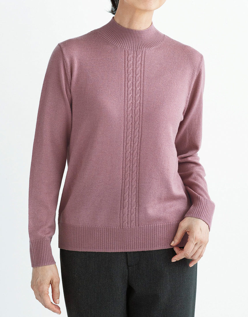 前身頃の中央に入れたケーブル柄ですっきり細見せ。首もとにそうハイネックと袖口、裾はリブ編です。LOVE BODY 2023冬号ゆららP5-2に掲載されています。
