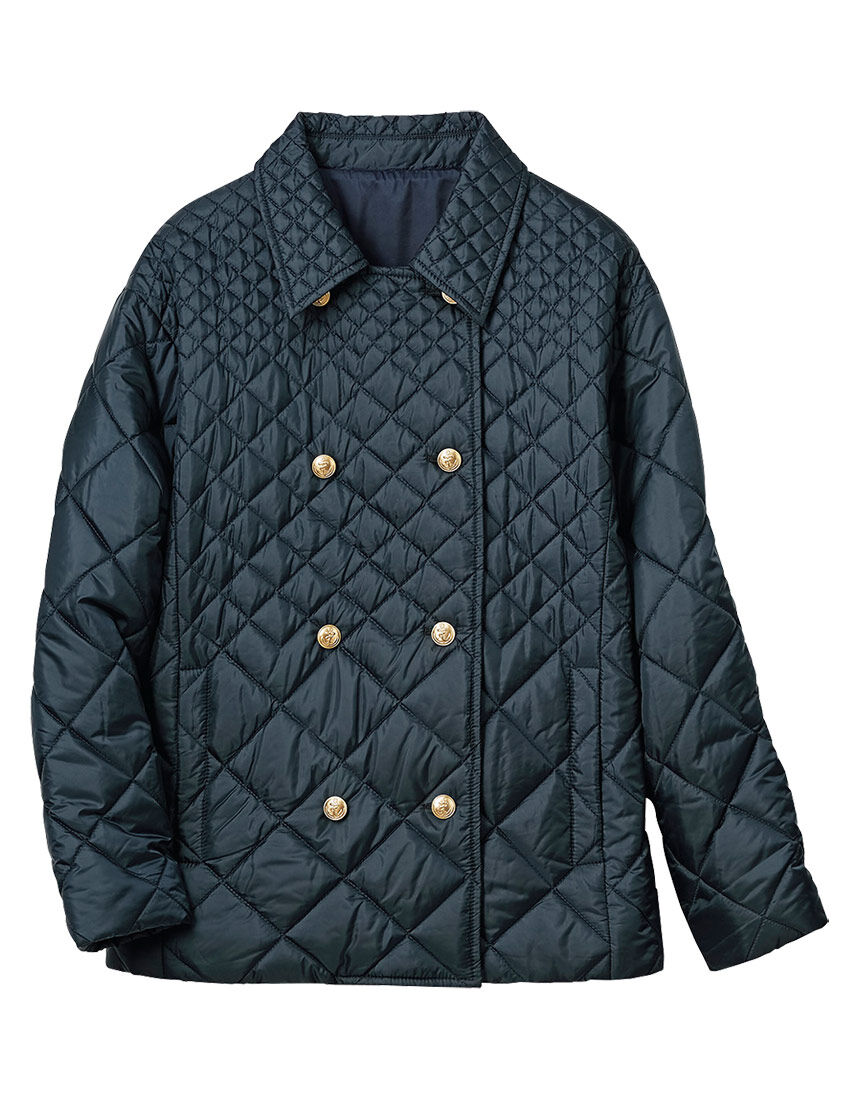 中わた入りダイヤ柄キルト素材で今風な軽快さにアレンジした大人感あるピーコート中わたにサーモライトRを使用。裾から上に向って細かくなるおしゃれなダイヤ柄キルトに金色の釦がアクセントです。LOVE BODY 2023冬号 P13-1に掲載されています。サーモライトRはThe LYCRA Companyの登録商標です