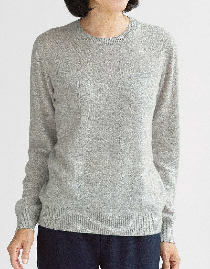 首もとすっきりの、ラウンドネックセーター着まわしやすくて素材の良さも引き立つシンプルなデザイン。LOVE BODY 2023冬号 P18-2に掲載されています。