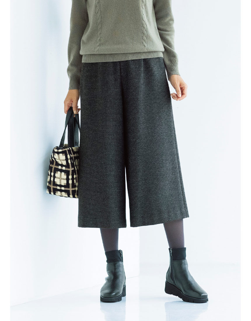 しなやかなウール混素材の広がりすぎないすっきり見えるガウチョあたたかみのある冬らしい風合いと合わせやすい細かなツイードが魅力のウォッシャブルウール混素材です。LOVE BODY 2023冬号 P60-2に掲載されています。