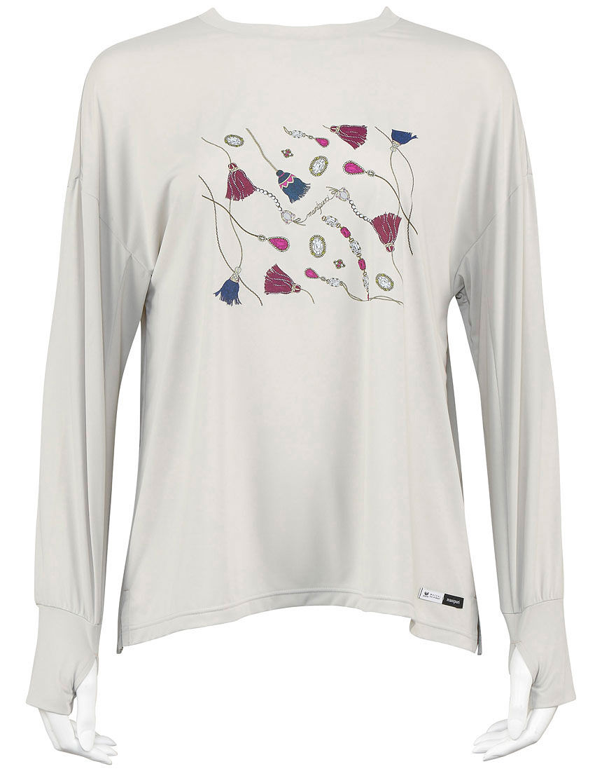アウタートップス【柄・デザイン】アンティーク風な飾り紐や房飾りとジュエリーを組み合わせ、まるで宝石箱を覗いたようなタッセル&ビジュー柄◆丸首・長袖◆ロング丈◆吸汗速乾(本体)◆袖口サムホールつき◆UVカット率90%以上(本体)お店から おしりが隠れるぐらいのロング丈で、後ろ下がりのAラインシルエットで体型をカバーし、スタイルアップ。ショートパンツやレギンスなどとコーディネイトしやすいTシャツです。やや詰まったネックデザインがトレンド感を演出しつつ首元の露出を抑え、また袖口にサムホールがついているので手の甲までカバー。ヴィンテージスカーフの魅力をたくさんの人へ伝えたいとの思いで立ち上げられた人気ブランド「manipuri」とのコラボアイテムです。