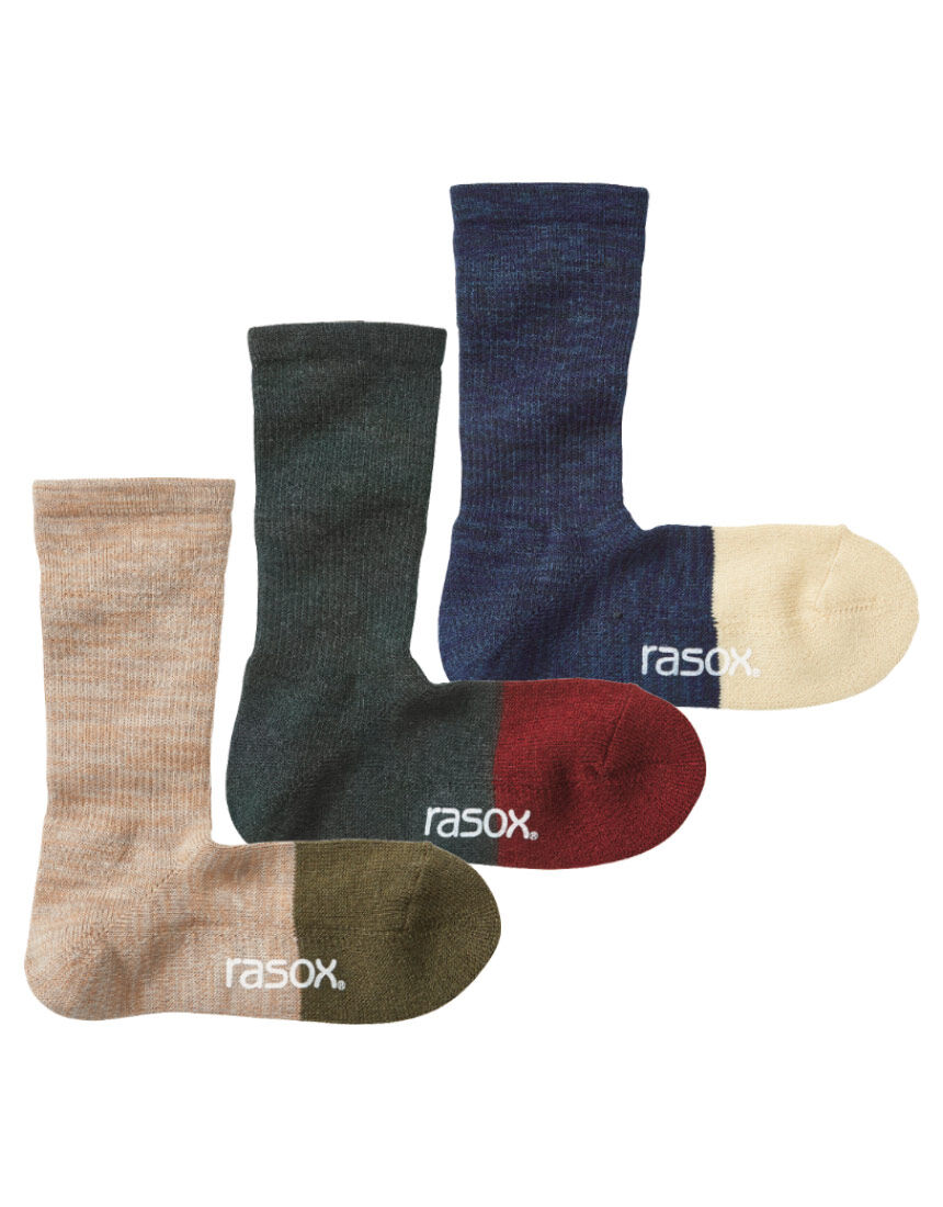 LOVE BODYセレクション rasox (ラソックス)各色1足ずつ3色組冬にうれしい厚手ではきごこち、ふんわりたるみにくく足にやさしくフィット。足底をパイル調に編んでクッション性を高めているので、歩きごこちよくルームソックスにもおすすめです。LOVE BODY 2023冬号ゆららP26-7に掲載されています。