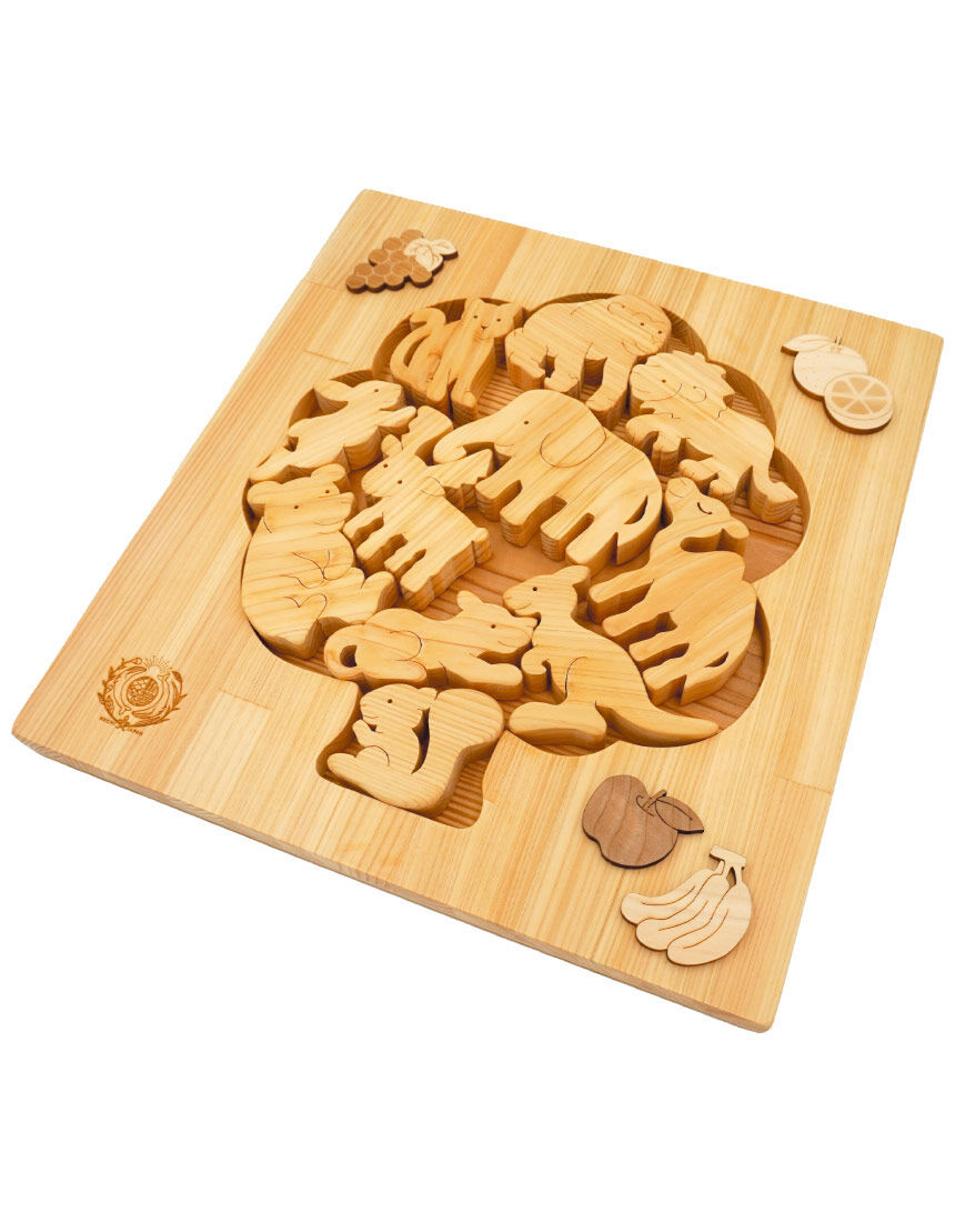 LOVE BODYセレクション 山のくじら舎木の香りや感触を楽しんで陸の動物たちと遊ぶパズル国産のヒノキやスギの木肌をいかした無着色仕上げ。枠に納めるパズル遊びは答えがいくつもあり、こどもたちの空間認識力を高めるのに有効と言われています。積み木やごっこ遊びなどもでき、成長に合わせ自由な発想で楽しめます。LOVE BODY 2023冬号ギフトチラシに掲載されています。