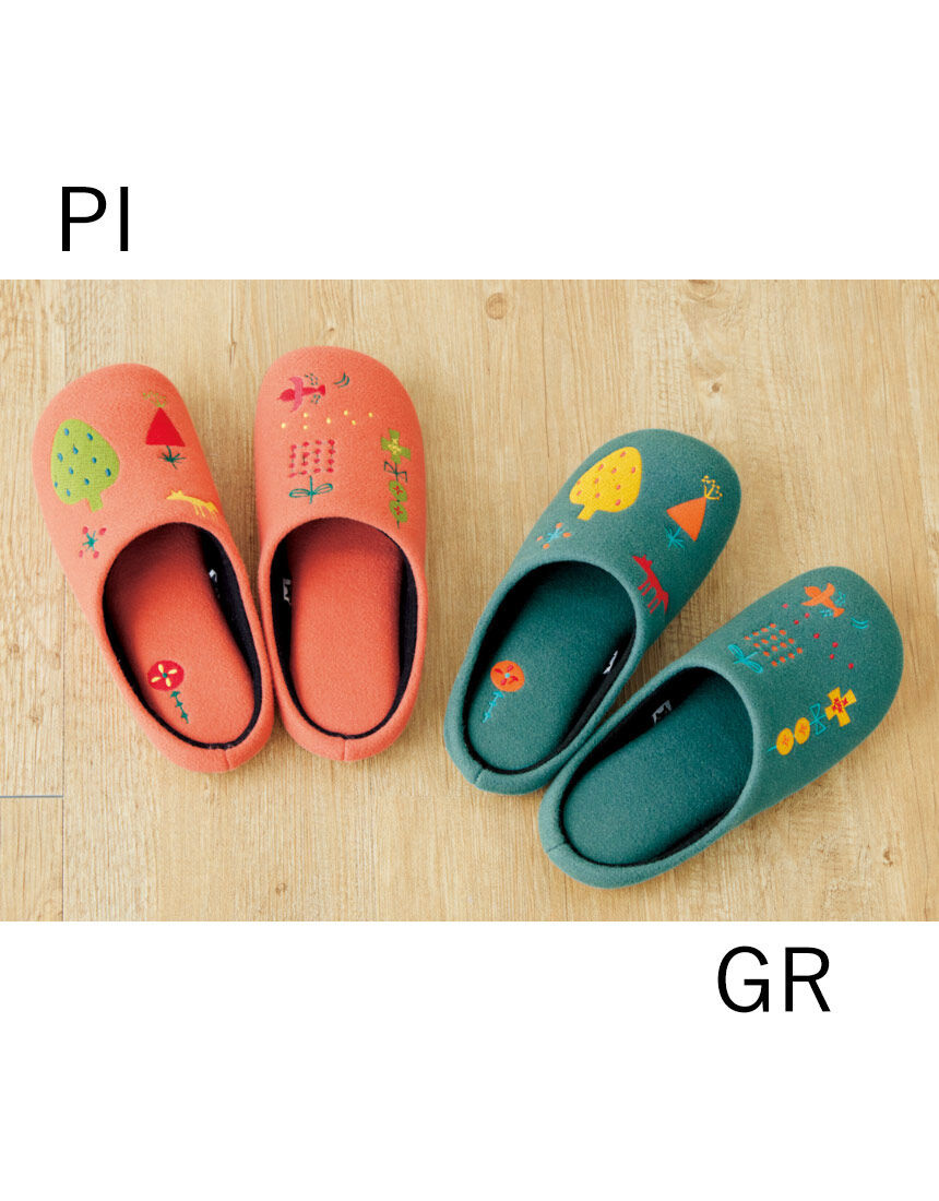 LOVE BODYセレクション Atsuko Matano小さな森のものがたりを甲と左足の中敷に刺しゅうしたデザイン。足をソフトに包む形状です。LOVE BODY 2023冬号マタノアツコチラシに掲載されています。