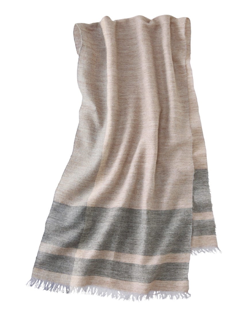 LOVE BODYセレクション ベルモード×高明工房アルパカ混の冬らしいストール2色のアルパカ混の緯糸と3色のシルクの経糸で織り上げました。シャンブレー調の色合いに両端のブロック柄がアクセントです。LOVE BODY 2023冬号 P45-2に掲載されています。