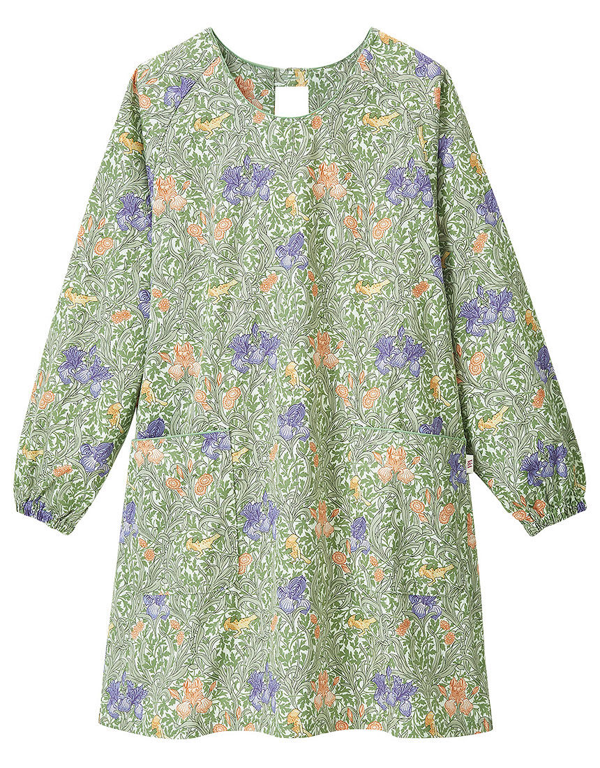 LOVE BODYセレクション V & A美しい彩りのアイリス柄が上品な割烹着近代デザインの創始者ウィリアム・モリス監修の柄。綿100%の生地で、ウエストを絞って着用できます。LOVE BODY 2023冬号ゆららP24-7に掲載されています。
