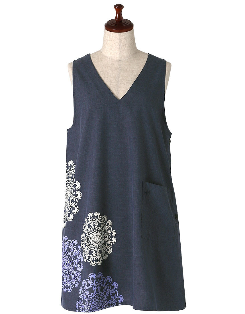 LOVE BODYセレクション HANAE MORI (ハナエモリ)メダリオン柄が素敵なハナエモリのエプロンお手入れしやすいポリエステル素材。肩ひもが落ちにくい左サイドボタン3個のデザインです。LOVE BODY 2023冬号ゆららP24-6に掲載されています。