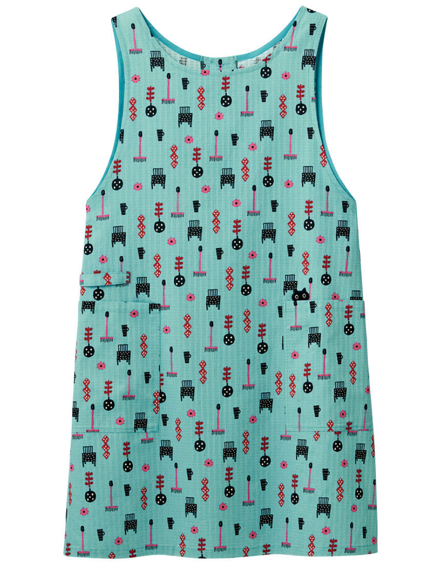 LOVE BODYセレクション Atsuko Matano地模様のある綿100%の生地に、休日が楽しくなる家具やグッズなどのモチーフをプリント。肩ひもが落ちにくい後ろ釦留め仕様で便利な右脇にタオル掛け付です。LOVE BODY 2023冬号マタノアツコチラシに掲載されています。