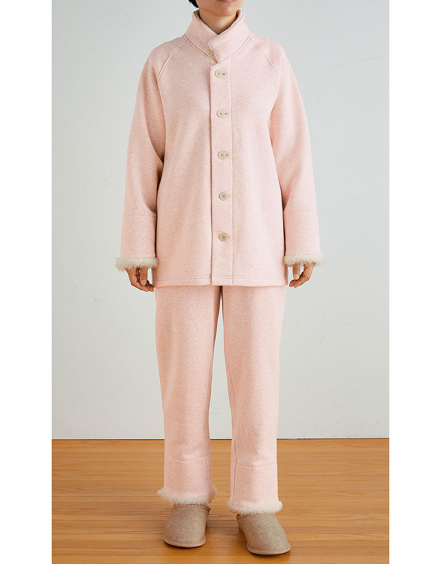 LOVE BODYセレクション Merinon (メリノン)袖口と足口にメリノンを使ったあったかパジャマふんわりとした綿100%の裏起毛素材で袖口と足口の肌側にメリノンを使用。首もとを包む襟裏は綿素材で、パンツのウエストはくい込みにくい仕様です。LOVE BODY 2023冬号ゆららP20-3に掲載されています。
