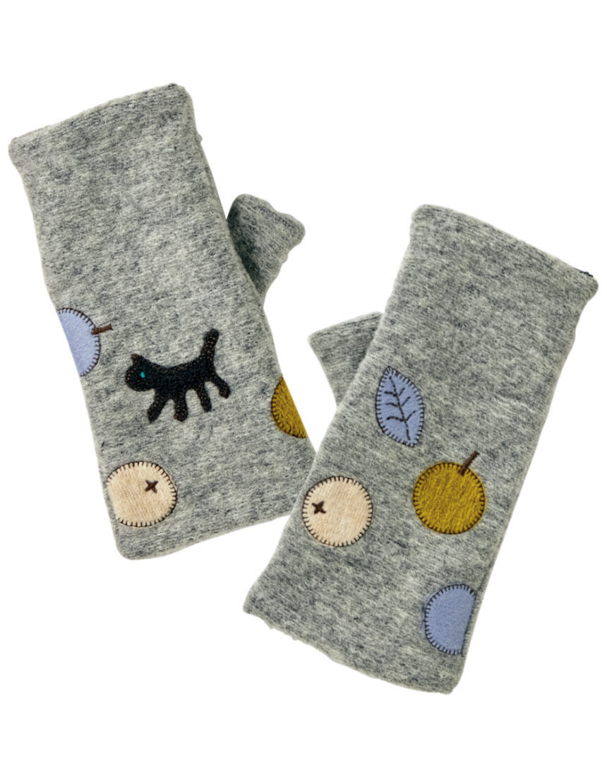 LOVE BODYセレクション Atsuko Matanoニット地にお散歩する子猫と木の実をアップリケ。裏ボアのぬくもりで手の甲まで覆い指先は出せる仕様です。LOVE BODY 2023冬号マタノアツコチラシに掲載されています。