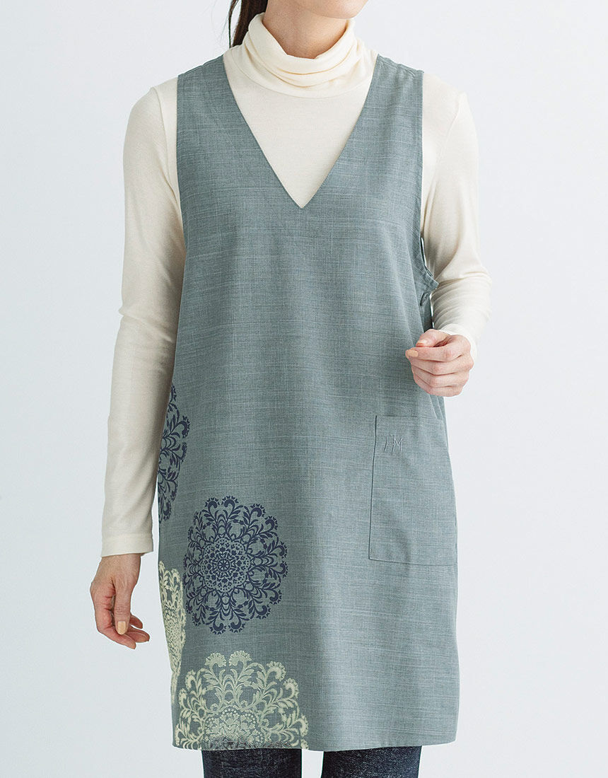 LOVE BODYセレクション HANAE MORI (ハナエモリ)メダリオン柄が素敵なハナエモリのエプロンお手入れしやすいポリエステル素材。肩ひもが落ちにくい左サイドボタン3個のデザインです。LOVE BODY 2023冬号ゆららP24-6に掲載されています。