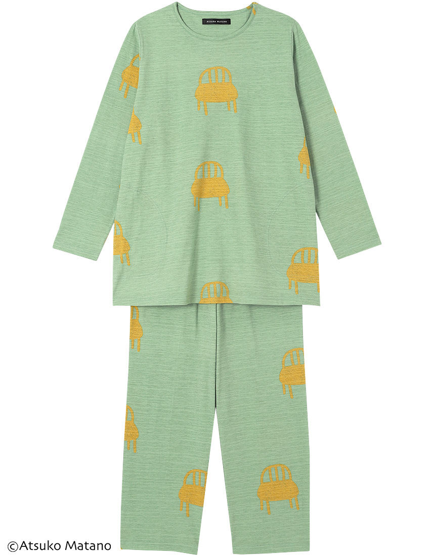 【パジャマ(ロング袖ロングパンツ)】クリエーター"俣野温子"氏がデザインする、甘くなりすぎない大人かわいいテキスタイルとカラーで、くつろぎ時間を楽しく過ごせるパジャマ&ルームウェア少しフシの見える生地感が特徴でやさしい肌ざわりの綿100%天竺素材。お昼寝がしたくなる大きい椅子をプリントで表現。【サイズ詳細】M:身幅53.5cm 着丈72.0cm 身丈74.5cm 肩幅39.0cm 袖丈56.5cm ボトム脇丈95.0cm 裾まわり43.0cm ウエスト58.0cm ヒップ100.5cm 股下(レングス)67.5cm L:身幅57.5cm 着丈72.0cm 身丈74.5cm 肩幅40.5cm 袖丈56.5cm ボトム脇丈95.5cm 裾まわり45.0cm ウエスト63.0cm ヒップ104.5cm 股下(レングス)67.5cm LL:身幅61.5cm 着丈73.0cm 身丈75.5cm 肩幅42.0cm 袖丈57.0cm ボトム脇丈96.0cm 裾まわり48.0cm ウエスト68.0cm ヒップ109.5cm 股下(レングス)67.5cm※出来上がり寸法を表示しております※サイズ詳細の寸法には多少の差異がございます出来上がり寸法の測り方についてはこちら※アイテムによって柄の出方が異なりますのでご了承ください。
