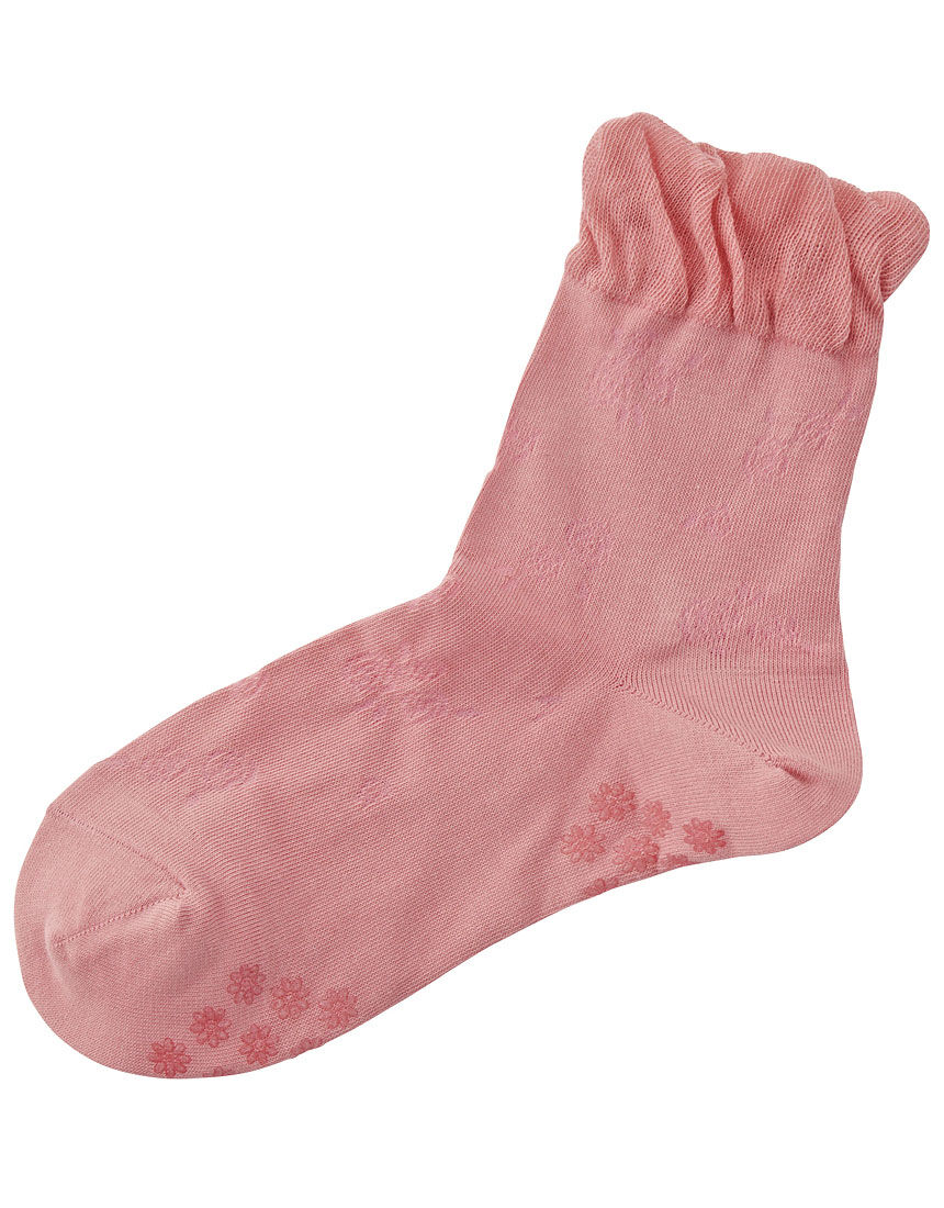 足口ゆったりの"らくラク"ソックス。かわいい花柄で、足底部分には花型のすべり止め付き。