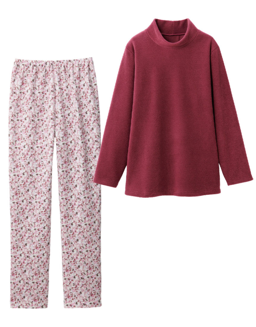 あったか異素材の無地とプリントの組み合わせがおしゃれ。トップは厚手のフリース素材で、首もとをあたたかく包むハイネック。ボトムは大人可愛い花柄のニットキルトでやさしいぬくもりです。LOVE BODY 2023冬号 P72-4に掲載されています。
