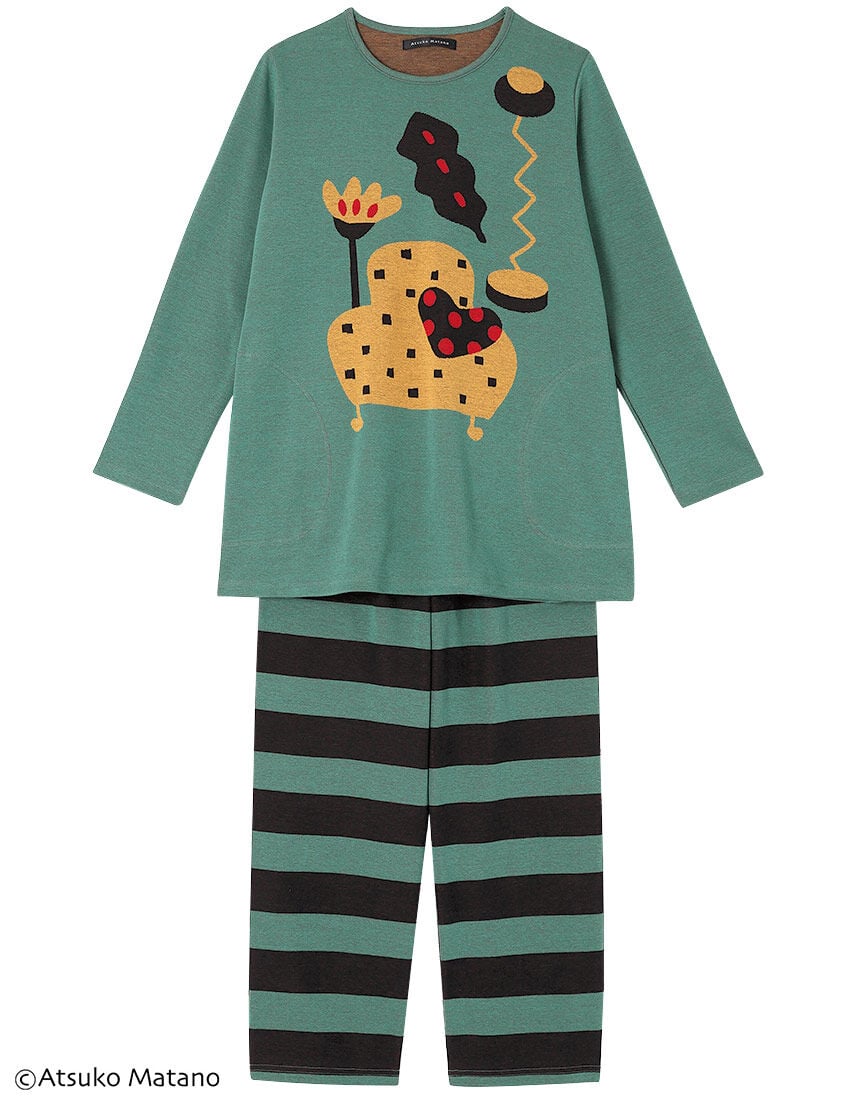 【パジャマ(ロング袖ロングパンツ)】クリエーター"俣野温子"氏がデザインする、甘くなりすぎない大人かわいいテキスタイルとカラーで、くつろぎ時間を楽しく過ごせるパジャマ&ルームウェア綿100%のジャカード素材。かわいらしい大きなソファーのテキスタイルとボーダーのボトムの組み合わせがオシャレ。【サイズ詳細】M:身幅53.5cm 着丈72.0cm 身丈74.5cm 肩幅39.0cm 袖丈56.5cm ボトム脇丈95.0cm 裾まわり43.0cm ウエスト58.0cm ヒップ100.5cm 股下(レングス)67.5cm L:身幅57.5cm 着丈72.0cm 身丈74.5cm 肩幅40.5cm 袖丈56.5cm ボトム脇丈95.5cm 裾まわり45.0cm ウエスト63.0cm ヒップ104.5cm 股下(レングス)67.5cm LL:身幅61.5cm 着丈73.0cm 身丈75.5cm 肩幅42.0cm 袖丈57.0cm ボトム脇丈96.0cm 裾まわり48.0cm ウエスト68.0cm ヒップ109.5cm 股下(レングス)67.5cm3L:身幅65.5cm 着丈74.0cm 身丈76.5cm 肩幅43.5cm 袖丈57.0cm ボトム脇丈96.5cm 裾まわり51.0cm ウエスト73.0cm ヒップ114.5cm 股下(レングス)67.0cm※出来上がり寸法を表示しております※サイズ詳細の寸法には多少の差異がございます出来上がり寸法の測り方についてはこちら※アイテムによって柄の出方が異なりますのでご了承ください。