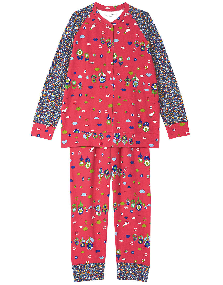 【パジャマ(ロング袖ロングパンツ)】毎日をもっと楽しく過ごせるように。嬉しいとき。不安なとき。ひとりのとき。家族といるとき。どんなときでもHAPPYなものを身につけて、笑顔になってもらいたい。デザイナー"津森千里"氏のそんな気持ちを表現したブランド。・カジュアルな綿100%ミニ裏毛素材・花柄のパッチワーク使いで、北欧の女の子が着ているイメージのデザイン・肩が動かしやすいラグランスリーブ切り替えで両脇にスラッシュポケット付き【サイズ詳細】M:身幅54.0cm 着丈66.0cm 身丈69.0cm 裄丈77.0cm ボトム脇丈98.0cm 裾まわり34.0cm ウエスト58.0cm ヒップ100.5cm 股下(レングス)69.5cm L:身幅58.0cm 着丈67.0cm 身丈70.0cm 裄丈78.0cm ボトム脇丈99.0cm 裾まわり36.0cm ウエスト63.0cm ヒップ104.5cm 股下(レングス)69.5cm LL:身幅62.0cm 着丈68.0cm 身丈71.0cm 裄丈79.0cm ボトム脇丈99.5cm 裾まわり38.0cm ウエスト68.0cm ヒップ109.5cm 股下(レングス)70.0cm※出来上がり寸法を表示しております※サイズ詳細の寸法には多少の差異がございます出来上がり寸法の測り方についてはこちら※アイテムによって柄の出方が異なりますのでご了承ください。表面フラッシュにご注意ください台所等で火を扱う場合には、表面の毛羽に引火することがありますので、十分にご注意ください。また、裏返して着用しないでください。「表面フラッシュとは」生地の表面毛羽に着火した火が、毛羽から毛羽へ、非常に早いスピードで、瞬時に火が走る現象です。パイル・タオル地や表面を起毛した素材で起こりやすく、綿やレーヨンなど植物せんい使用の素材にも、注意が必要です。これにより、火傷や火事になることも考えられます。炊事や暖房機具等の火には、十分ご注意ください。