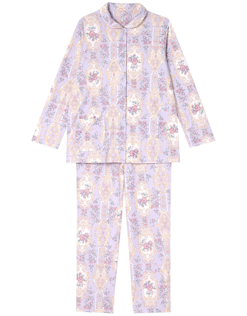 【パジャマ(ロング袖ロングパンツ)】1793年に誕生以来、代表される「ハドンホール」柄を始め、多くのコレクションを世に送り出し続けている「ミントン」。その気品あふれる美しい柄を使用したパジャマ。<ハドンホール>*柄をアレンジした壁紙調の柄は、大ぶりのオーナメントとアンティークハドンのモチーフを組み合わせた新鮮なデザイン。薄手なのに、ふわっとやわらかなスムース素材です。プリントが引き立つすっきりとした前あきタイプのパジャマです。*<ハドンホール>1948年にデザインされ、発売以来、世界中で愛されているロングセラーの図柄。パッションフラワー、パンジー、カーネーションなどが図案化され、東洋的なエキゾチシズムが感じられるデザインです。[資料元:(株)川島織物セルコン]※アイテムによって柄の出方が異なりますのでご了承ください。【サイズ詳細】M:身幅52.0cm 着丈67.0cm 身丈69.5cm 肩幅40.0cm 袖丈55.0cm ボトム脇丈95.0cm 裾まわり39.0cm ウエスト55.0cm ヒップ100.5cm 股下(レングス)67.5cm L:身幅56.0cm 着丈67.0cm 身丈70.0cm 肩幅41.5cm 袖丈55.0cm ボトム脇丈95.5cm 裾まわり41.0cm ウエスト59.0cm ヒップ104.5cm 股下(レングス)67.0cm LL:身幅60.0cm 着丈68.0cm 身丈71.0cm 肩幅43.0cm 袖丈55.5cm ボトム脇丈96.0cm 裾まわり44.0cm ウエスト64.0cm ヒップ109.5cm 股下(レングス)67.0cm※出来上がり寸法を表示しております※サイズ詳細の寸法には多少の差異がございます出来上がり寸法の測り方についてはこちら
