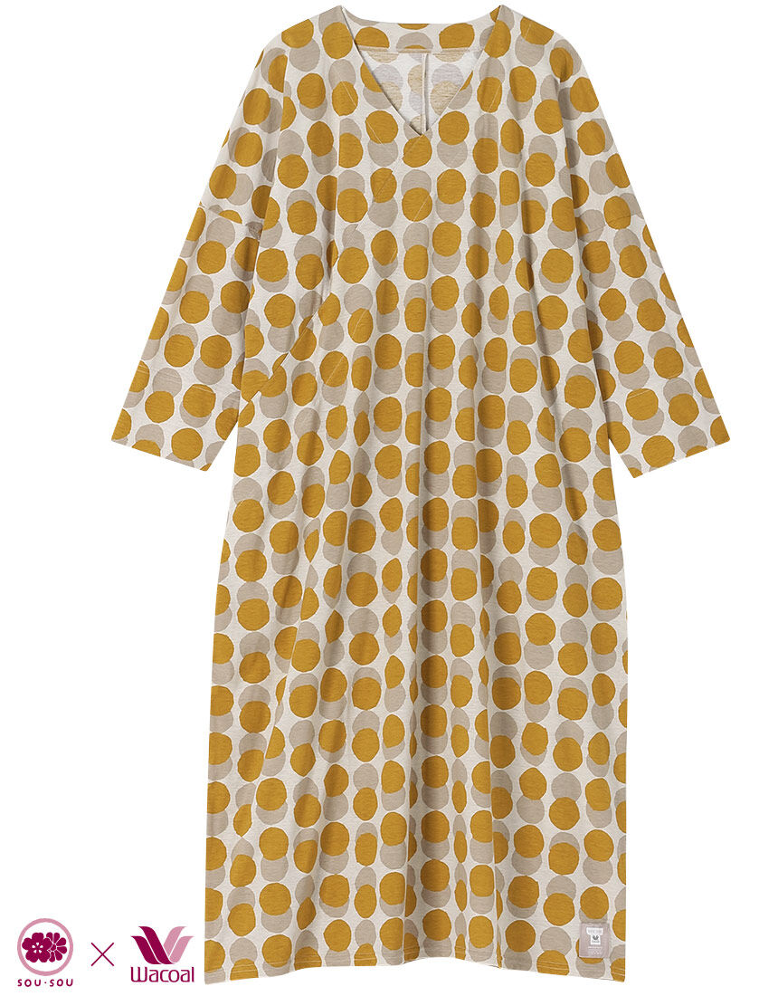 【ワンピース(8分袖)】『新しい日本文化の創造』をコンセプトに、現代のライフスタイルに寄り添うものづくりを展開する京都のブランド「SOU・SOU」デザイン、生地、縫製のすべてをMADE IN JAPANにこだわったインテリアウエアです。※「インテリアウエア」は若林株式会社の登録商標です。生地表面の毛羽を取る加工をほどこした強撚天竺素材は、強撚糸の持つシャリ感が涼しげで、やわらかく肌あたりのよい風合いが特徴です。和服の着付け方である抜き衣紋(ぬきえもん)をイメージした、衿が特徴の長方形型のワンピース。※アイテムによって柄の出方が異なりますのでご了承ください。【サイズ詳細】M-L:バスト140.0cm 着丈112.0cm※出来上がり寸法を表示しております。※サイズ詳細の寸法には多少の差異がございます。出来上がり寸法の測り方についてはこちら