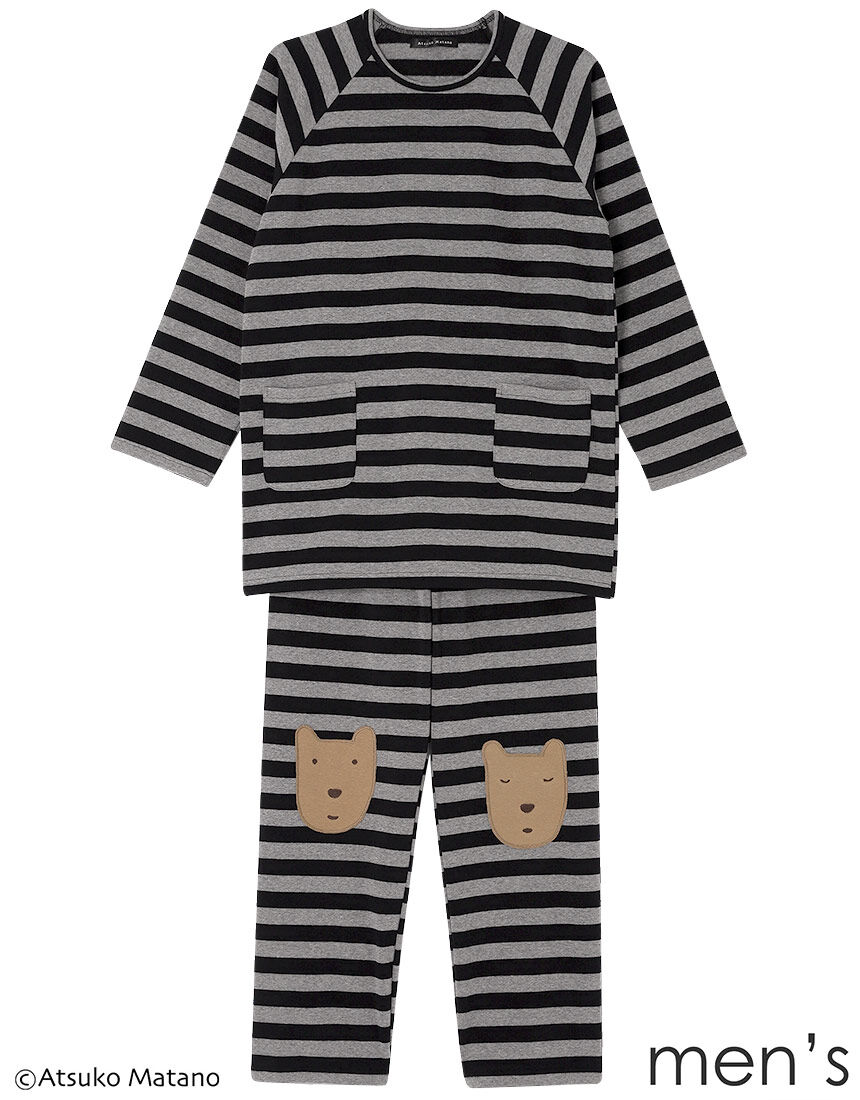 【メンズパジャマ(ロング袖ロングパンツ)】クリエーター"俣野温子"氏がデザインする、甘くなりすぎない大人かわいいテキスタイルとカラーで、くつろぎ時間を楽しく過ごせるパジャマ&ルームウェア肌側起毛であたたかい素材。太めのボーダー柄と、ひざについているかわいいくまのアップリケがポイント。【サイズ詳細】M:身幅55.0cm 着丈77.0cm 身丈79.0cm 裄丈80.0cm ボトム脇丈100.0cm 裾まわり44.0cm ウエスト70.0cm ヒップ106.0cm 股下(レングス)72.0cm L:身幅59.0cm 着丈82.0cm 身丈84.5cm 裄丈84.0cm ボトム脇丈105.5cm 裾まわり47.0cm ウエスト76.0cm ヒップ112.0cm 股下(レングス)76.0cm※出来上がり寸法を表示しております※サイズ詳細の寸法には多少の差異がございます出来上がり寸法の測り方についてはこちら※アイテムによって柄の出方が異なりますのでご了承ください。※レディースパジャマもございます。レディースパジャマはこちら表面フラッシュにご注意ください台所等で火を扱う場合には、表面の毛羽に引火することがありますので、十分にご注意ください。また、裏返して着用しないでください。「表面フラッシュとは」生地の表面毛羽に着火した火が、毛羽から毛羽へ、非常に早いスピードで、瞬時に火が走る現象です。パイル・タオル地や表面を起毛した素材で起こりやすく、綿やレーヨンなど植物せんい使用の素材にも、注意が必要です。これにより、火傷や火事になることも考えられます。炊事や暖房機具等の火には、十分ご注意ください。