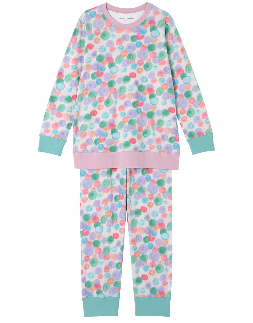 【パジャマ(ロング袖ロングパンツ)】毎日をもっと楽しく過ごせるように。嬉しいとき。不安なとき。ひとりのとき。家族といるとき。どんなときでもHAPPYなものを身につけて、笑顔になってもらいたい。デザイナー"津森千里"氏のそんな気持ちを表現したブランド。・接結天竺素材・森の木々の間からキラキラと輝く木漏れ日の様子を明るくかわいらしいカラーグラデーションのドットで表現したプリント・ネックや袖口を配色無地にすることでデザインポイントにしています【サイズ詳細】M:身幅52.0cm 着丈66.0cm 身丈69.5cm 肩幅40.0cm 袖丈57.0cm ボトム脇丈98.0cm 裾まわり31.0cm ウエスト58.0cm ヒップ97.5cm 股下(レングス)69.5cm L:身幅56.0cm 着丈67.0cm 身丈70.5cm 肩幅41.5cm 袖丈57.0cm ボトム脇丈99.0cm 裾まわり33.0cm ウエスト63.0cm ヒップ101.5cm 股下(レングス)69.5cm LL:身幅60.0cm 着丈68.0cm 身丈71.5cm 肩幅43.0cm 袖丈57.5cm ボトム脇丈99.5cm 裾まわり35.0cm ウエスト68.0cm ヒップ106.5cm 股下(レングス)70.0cm3L:身幅64.0cm 着丈69.0cm 身丈72.5cm 肩幅44.5cm 袖丈57.5cm ボトム脇丈100.0cm 裾まわり37.0cm ウエスト73.0cm ヒップ111.5cm 股下(レングス)70.0cm4L:身幅68.0cm 着丈70.0cm 身丈73.5cm 肩幅46.0cm 袖丈58.0cm ボトム脇丈100.5cm 裾まわり39.0cm ウエスト78.0cm ヒップ116.5cm 股下(レングス)70.0cm※出来上がり寸法を表示しております※サイズ詳細の寸法には多少の差異がございます出来上がり寸法の測り方についてはこちら※アイテムによって柄の出方が異なりますのでご了承ください。