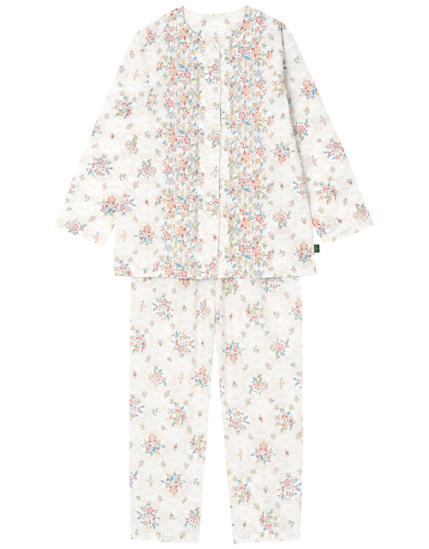 【パジャマ(ロング袖ロングパンツ)】ミントン1793年に誕生以来、代表される「ハドンホール」柄を始め、多くのコレクションを世に送り出すと共に、今もなお世界の各国王室やセレブリティに愛用され続けている「ミントン」。その気品あふれる美しい柄を使用したパジャマ。〈ハドンホール〉*の柄をアレンジした新柄。壁紙のような地模様と華やかで贅沢な花々を組み合わせたデザイン。凹凸があるので肌ばなれがここちよく、長袖パジャマは、春から夏におすすめ。*1948年にデザインされ、発売以来、世界中で愛されているロングセラーの図柄。パッションフラワー、パンジー、カーネーションなどが図案化され、東洋的なエキゾチシズムが感じられるデザイン。[資料元:(株)川島織物セルコン]※アイテムによって柄の出方が異なりますのでご了承ください。【サイズ詳細】M:バスト106.0cm 着丈67.0cm ズボン脇丈95.0cm ウエスト58.0cm L:バスト114.0cm 着丈67.0cm ズボン脇丈95.5cm ウエスト63.0cm※出来上がり寸法を表示しております。※サイズ詳細の寸法には多少の差異がございます。出来上がり寸法の測り方についてはこちら
