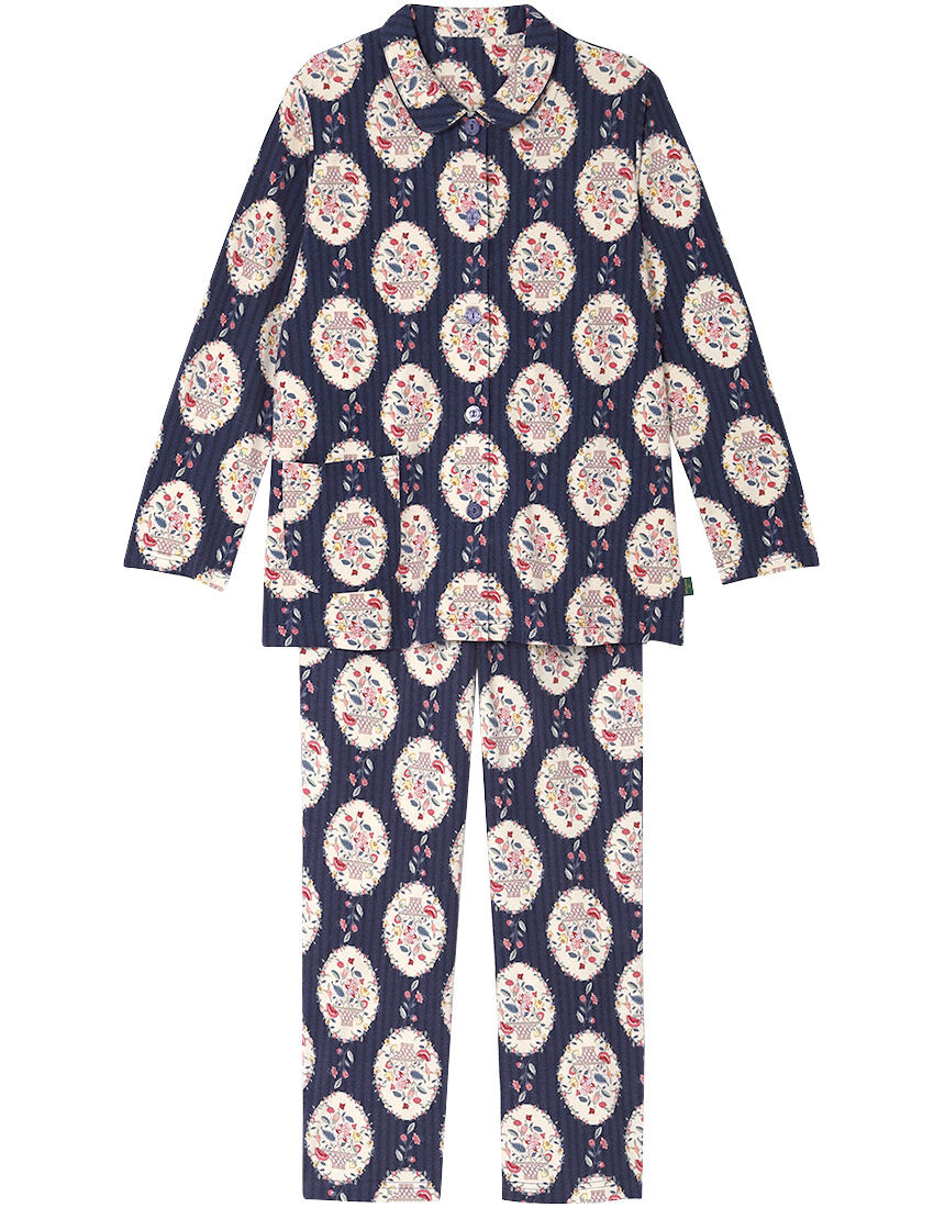 【パジャマ(ロング袖ロングパンツ)】1793年に誕生以来、代表される「ハドンホール」柄を始め、多くのコレクションを世に送り出し続けている「ミントン」。その気品あふれる美しい柄を使用したパジャマ。綾織りのようなストライプの柄に格子状に配された額縁風の模様がまるで壁紙のようで、インテリアを連想させる面白さと驚き、新鮮さを誘うデザイン。ふんわりとした表起毛をほどこしたあたたかなスムース素材。【サイズ詳細】M:身幅52.0cm 着丈67.0cm 身丈69.5cm 肩幅40.0cm 袖丈55.0cm ボトム脇丈95.0cm 裾まわり39.0cm ウエスト58.0cm ヒップ100.5cm 股下(レングス)67.5cm L:身幅56.0cm 着丈67.0cm 身丈70.0cm 肩幅41.5cm 袖丈55.0cm ボトム脇丈95.5cm 裾まわり41.0cm ウエスト63.0cm ヒップ104.5cm 股下(レングス)67.0cm※出来上がり寸法を表示しております※サイズ詳細の寸法には多少の差異がございます出来上がり寸法の測り方についてはこちら※アイテムによって柄の出方が異なりますのでご了承ください。表面フラッシュにご注意ください台所等で火を扱う場合には、表面の毛羽に引火することがありますので、十分にご注意ください。また、裏返して着用しないでください。「表面フラッシュとは」生地の表面毛羽に着火した火が、毛羽から毛羽へ、非常に早いスピードで、瞬時に火が走る現象です。パイル・タオル地や表面を起毛した素材で起こりやすく、綿やレーヨンなど植物せんい使用の素材にも、注意が必要です。これにより、火傷や火事になることも考えられます。炊事や暖房機具等の火には、十分ご注意ください。
