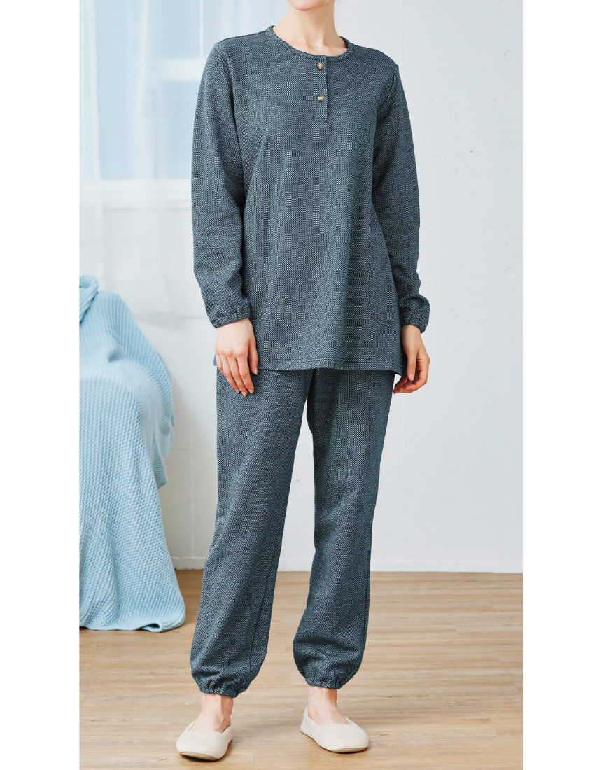 カジュアルな2つ釦の〈かぶりタイプ〉で袖口と足口はゴム仕様の着やすい〈綿混ニット〉パジャマ。綿混で肌ざわりよく着られるニット素材。落ちついた色合いでリラックスウェアとしても着まわせます。LOVE BODY 2023冬号 P68-4に掲載されています。