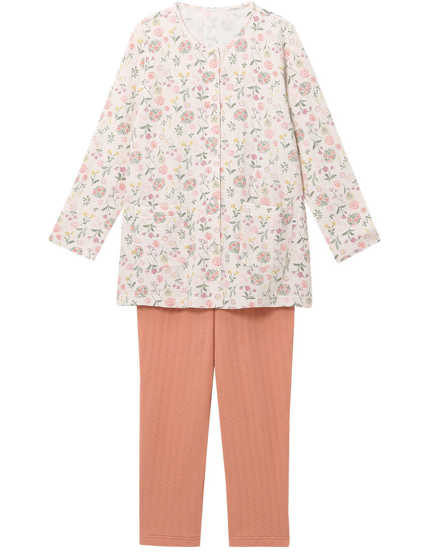 【パジャマ(ロング袖ロングパンツ)】「ワコール人間科学研究開発センター」の女性の体型データをもとにしたグランダー独自のサイズ設計は、ゆったり快適な着ごこち。グランダーならではの便利でやさしい工夫をほどこした親切設計のパジャマです。・着ごこちゆったり親切設計のポイント1.背・脇に縫い付けネームがなく、やさしい肌あたり2.留めはずしラクラク大きめボタン3.やわらかなゴムでウエストがラク4.深めの前合わせですきまから胸もとが見えにくい5.ズボンの前後がわかりやすい目印付き6.くいこみにくく動きやすいマチ付き7.裾口、袖口、ウエストにゴム替え口接結ニットの間に中わたを編みこんだキルトニット素材。ふんわりとした肌ざわりで保温性にもすぐれています。波形のステッチで、中わたのふくらみがやわらかく出るように工夫。のどかでかわいらしい印象の花柄プリント。ベーシックなセットインスリーブで、すっきりとした印象のデザイン。無地のボトムでくつろぎ時間にもおすすめ。【サイズ詳細】SP:身幅49.5cm 着丈63.5cm 身丈66.0cm 肩幅37.0cm 袖丈53.5cm ボトム脇丈90.0cm 裾まわり32.5cm ウエスト55.0cm 股下(レングス)62.0cm ヒップ101.5cm MP:身幅53.5cm 着丈63.5cm 身丈66.0cm 肩幅39.0cm 袖丈53.5cm ボトム脇丈90.5cm 裾まわり34.0cm ウエスト60.0cm 股下(レングス)62.0cm ヒップ106.5cm LP:身幅57.5cm 着丈63.5cm 身丈66.5cm 肩幅41.0cm 袖丈53.5cm ボトム脇丈91.5cm 裾まわり35.5cm ウエスト65.0cm 股下(レングス)62.0cm ヒップ111.5cm M:身幅53.5cm 着丈68.5cm 身丈71.5cm 肩幅40.0cm 袖丈55.0cm ボトム脇丈95.5cm 裾まわり34.0cm ウエスト60.0cm 股下(レングス)65.5cm ヒップ109.5cm L:身幅57.5cm 着丈68.5cm 身丈71.5cm 肩幅42.0cm 袖丈55.0cm ボトム脇丈96.5cm 裾まわり35.5cm ウエスト65.0cm 股下(レングス)65.5cm ヒップ114.5cm※出来上がり寸法を表示しております※サイズ詳細の寸法には多少の差異がございます出来上がり寸法の測り方についてはこちら※アイテムによって柄の出方が異なりますのでご了承ください。