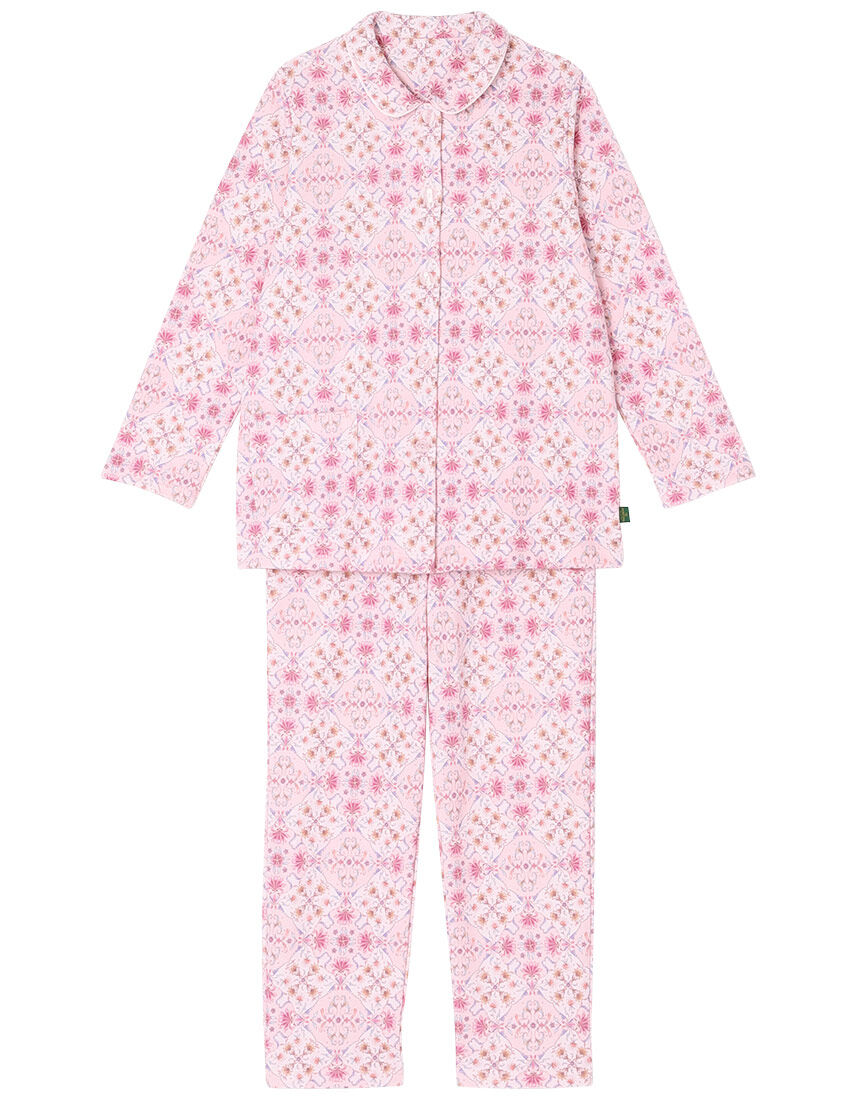 【パジャマ(ロング袖ロングパンツ)】1793年に誕生以来、代表される「ハドンホール」柄を始め、多くのコレクションを世に送り出し続けている「ミントン」。その気品あふれる美しい柄を使用したパジャマ。動きのあるモチーフをいくつか組み合わせてつくったジオメトリック柄。ベース部分に格子状に2色の色を入れ、立体感を効果的に出したデザイン。吸湿発熱機能糸を肌側に使用。裏起毛加工をほどこし、空気を含む層をつくることで、よりあたたかみのあるダブルジャカード素材。【サイズ詳細】S:身幅48.0cm 着丈67.0cm 身丈69.5cm 肩幅39.0cm 袖丈54.5cm ボトム脇丈95.0cm 裾まわり37.0cm ウエスト53.0cm ヒップ97.0cm 股下(レングス)68.0cm M:身幅52.0cm 着丈67.0cm 身丈69.5cm 肩幅40.0cm 袖丈55.0cm ボトム脇丈95.0cm 裾まわり39.0cm ウエスト58.0cm ヒップ100.5cm 股下(レングス)67.5cm L:身幅56.0cm 着丈67.0cm 身丈70.0cm 肩幅41.5cm 袖丈55.0cm ボトム脇丈95.5cm 裾まわり41.0cm ウエスト63.0cm ヒップ104.5cm 股下(レングス)67.0cm LL:身幅60.0cm 着丈68.0cm 身丈71.0cm 肩幅43.0cm 袖丈55.5cm ボトム脇丈96.0cm 裾まわり44.0cm ウエスト68.0cm ヒップ109.5cm 股下(レングス)67.5cm3L:身幅64.0cm 着丈69.0cm 身丈72.0cm 肩幅44.5cm 袖丈55.5cm ボトム脇丈96.5cm 裾まわり47.0cm ウエスト73.0cm ヒップ114.5cm 股下(レングス)67.0cm※出来上がり寸法を表示しております※サイズ詳細の寸法には多少の差異がございます出来上がり寸法の測り方についてはこちら表面フラッシュにご注意ください台所等で火を扱う場合には、表面の毛羽に引火することがありますので、十分にご注意ください。また、裏返して着用しないでください。「表面フラッシュとは」生地の表面毛羽に着火した火が、毛羽から毛羽へ、非常に早いスピードで、瞬時に火が走る現象です。パイル・タオル地や表面を起毛した素材で起こりやすく、綿やレーヨンなど植物せんい使用の素材にも、注意が必要です。これにより、火傷や火事になることも考えられます。炊事や暖房機具等の火には、十分ご注意ください。