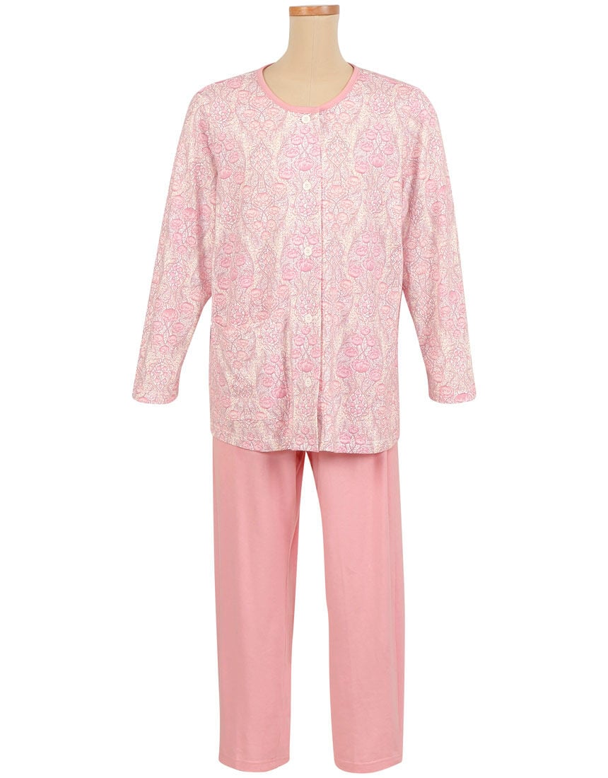 【長袖・丸型ボタン】壁紙のような柄がエレガント。秋にも着られる薄手素材。ボトムは無地。※トップス前ポケット付き、ボトムロング丈【サイズ詳細】※身長146cm?154cmに対応しています。SP:バスト100.0cm、着丈63.0cm、ズボン脇丈91.0cm、ウエスト60.0cm MP:バスト108.0cm、着丈63.0cm、ズボン脇丈92.0cm、ウエスト65.0cm LP:バスト116.0cm、着丈63.0cm、ズボン脇丈93.0cm、ウエスト71.0cm LLP:バスト124.0cm、着丈63.0cm、ズボン脇丈94.0cm、ウエスト77.0cm※でき上がり寸法を表示しています。※サイズ詳細の寸法には多少の差異がございます。出来上がり寸法の測り方についてはこちら
