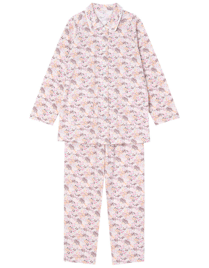 【パジャマ(ロング袖ロングパンツ)】吸湿発熱性のある糸を肌側に使用したキルトニット。保温性にすぐれた、とてもあたたかな素材。繊細な色のトーンで表現した花柄はエアリーな印象。【サイズ詳細】S:身幅48.0cm 着丈67.0cm 身丈69.5cm 肩幅39.0cm 袖丈54.5cm ボトム脇丈95.0cm 裾まわり37.0cm ウエスト53.0cm ヒップ97.0cm 股下(レングス)68.0cm M:身幅52.0cm 着丈67.0cm 身丈69.5cm 肩幅40.0cm 袖丈55.0cm ボトム脇丈95.0cm 裾まわり39.0cm ウエスト58.0cm ヒップ100.5cm 股下(レングス)67.5cm L:身幅56.0cm 着丈67.0cm 身丈70.0cm 肩幅41.5cm 袖丈55.0cm ボトム脇丈95.5cm 裾まわり41.0cm ウエスト63.0cm ヒップ104.5cm 股下(レングス)67.0cm LL:身幅60.0cm 着丈68.0cm 身丈71.0cm 肩幅43.0cm 袖丈55.5cm ボトム脇丈96.0cm 裾まわり44.0cm ウエスト68.0cm ヒップ109.5cm 股下(レングス)67.0cm※出来上がり寸法を表示しております※サイズ詳細の寸法には多少の差異がございます出来上がり寸法の測り方についてはこちら※アイテムによって柄の出方が異なりますのでご了承ください。