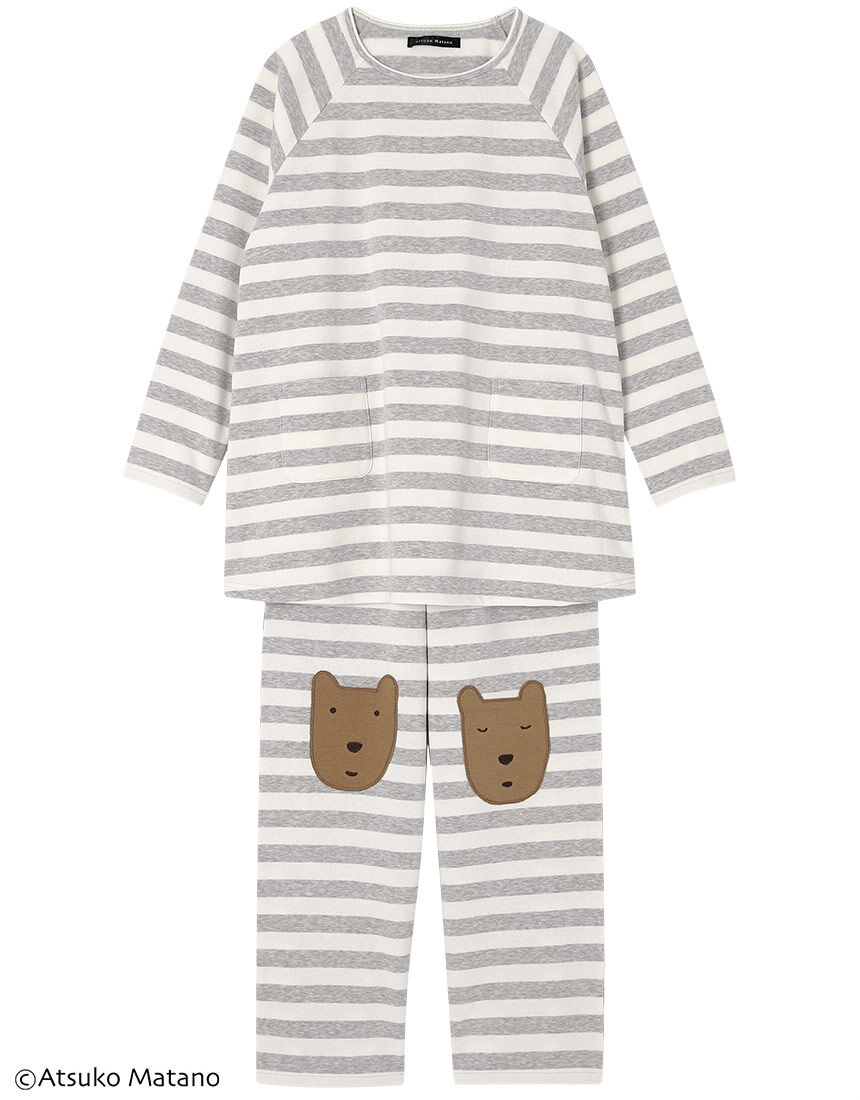 【パジャマ(ロング袖ロングパンツ)】クリエーター"俣野温子"氏がデザインする、甘くなりすぎない大人かわいいテキスタイルとカラーで、くつろぎ時間を楽しく過ごせるパジャマ&ルームウェア肌側起毛であたたかい素材。太めのボーダー柄と、ひざについているかわいいくまのアップリケがポイント。【サイズ詳細】M:身幅53.5cm 着丈69.5cm 身丈72.5cm 裄丈75.0cm ボトム脇丈95.0cm 裾まわり43.0cm ウエスト58.0cm ヒップ100.5cm 股下(レングス)67.5cm L:身幅57.5cm 着丈69.5cm 身丈72.5cm 裄丈76.0cm ボトム脇丈95.5cm 裾まわり45.0cm ウエスト63.0cm ヒップ104.5cm 股下(レングス)67.5cm LL:身幅61.5cm 着丈70.5cm 身丈73.5cm 裄丈77.0cm ボトム脇丈96.0cm 裾まわり48.0cm ウエスト68.0cm ヒップ109.5cm 股下(レングス)67.5cm※出来上がり寸法を表示しております※サイズ詳細の寸法には多少の差異がございます出来上がり寸法の測り方についてはこちら※アイテムによって柄の出方が異なりますのでご了承ください。※メンズパジャマもございます。メンズパジャマはこちら表面フラッシュにご注意ください台所等で火を扱う場合には、表面の毛羽に引火することがありますので、十分にご注意ください。また、裏返して着用しないでください。「表面フラッシュとは」生地の表面毛羽に着火した火が、毛羽から毛羽へ、非常に早いスピードで、瞬時に火が走る現象です。パイル・タオル地や表面を起毛した素材で起こりやすく、綿やレーヨンなど植物せんい使用の素材にも、注意が必要です。これにより、火傷や火事になることも考えられます。炊事や暖房機具等の火には、十分ご注意ください。
