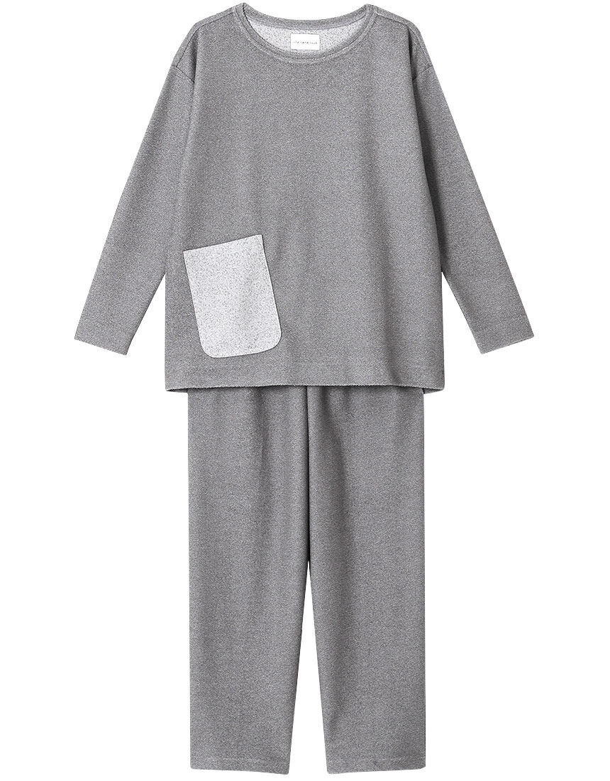 アウターアイテムに使用されるテキスタイル(生地)で、少量ずつ余った生地をウンナナクールがパジャマづくりに再利用。本来は上質なアウター用途に生産されたテキスタイル(生地)の中から、パジャマにぴったりな肌触りや風合いのものを厳選して使用しています。テキスタイル(生地)に限りがあるため、各カラーともに数量限定でのご用意になります。少量しか生産ができない分生地や縫製のクオリティからすると、驚くほどコスパの高い商品ラインナップがご用意できました。カジュアルな表情が印象的なパイル生地を使用したスウェットパジャマ。表と裏で雰囲気の違う生地を組み合わせたポケットがデザインポイント。家でくつろぐ時や就寝時のラウンジウェアとしてもおすすめのアイテムです。【サイズ詳細】M:バスト106.0cm 着丈65.0cm ズボン脇丈95.0cm ウエスト55.0cm※出来上がり寸法を表示しております。※サイズ詳細の寸法には多少の差異がございます。