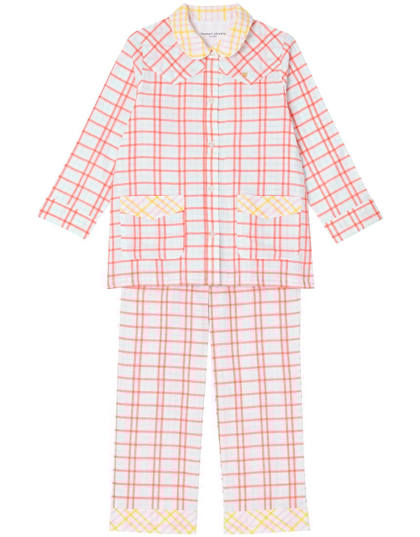 【パジャマ(ロング袖ロングパンツ)】毎日をもっと楽しく過ごせるように。嬉しいとき。不安なとき。ひとりのとき。家族といるとき。どんなときでもHAPPYなものを身につけて、笑顔になってもらいたい。デザイナー"津森千里"氏のそんな気持ちを表現したブランド。テーマ:春 <ウェスタンカウガール>プリンセスCがタイムスリップしたのはアメリカ西部開拓時代。アリゾナのサボテンが生えている美しい自然の中、カウガールになって登場。ウェスタン調のプリント柄で展開します。オーガニックコットンを使用した二重ガーゼ素材。可愛らしい色合いのチェックでウェスタンシャツ風のデザインになっています。※アイテムによって柄の出方が異なりますのでご了承ください。【サイズ詳細】M:バスト104.0cm 着丈70.0cm ズボン脇丈95.0cm ウエスト55.0cm L:バスト112.0cm 着丈71.0cm ズボン脇丈95.0cm ウエスト59.0cm※出来上がり寸法を表示しております。※サイズ詳細の寸法には多少の差異がございます。出来上がり寸法の測り方についてはこちら