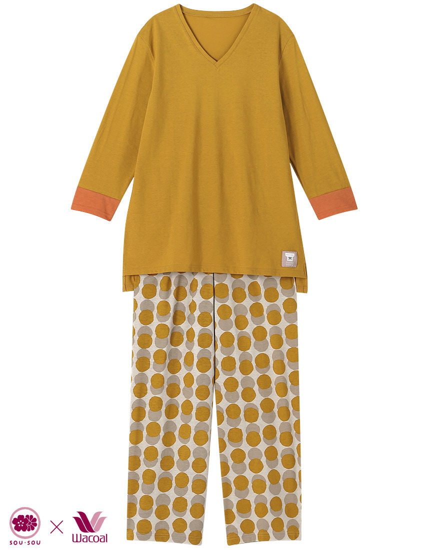 【ルームウェア(8分袖ロングパンツ)】『新しい日本文化の創造』をコンセプトに、現代のライフスタイルに寄り添うものづくりを展開する京都のブランド「SOU・SOU」デザイン、生地、縫製のすべてをMADE IN JAPANにこだわったインテリアウエアです。※「インテリアウエア」は若林株式会社の登録商標です。生地表面の毛羽を取る加工をほどこした強撚天竺素材は、強撚糸の持つシャリ感が涼しげで、やわらかく肌あたりのよい風合いが特徴です。すっきりとしたVネックで袖口の切り替えがデザインのポイント。【ユニセックス品番】M & hellip;レディースのMサイズ相当L & hellip;レディースのLサイズ相当MA & hellip;メンズのMサイズ相当LA & hellip;メンズのLサイズ相当※MAは身長の高い女性にもおすすめ。※アイテムによって柄の出方が異なりますのでご了承ください。【サイズ詳細】M:バスト100.0cm 着丈70.0cm ズボン脇丈95.0cm ウエスト58.0cm L:バスト108.0cm 着丈70.0cm ズボン脇丈95.5cm ウエスト63.0cm MA:チェスト108.0cm 着丈74.5cm ズボン脇丈100.0cm ウエスト66.0cm LA:チェスト116.0cm 着丈79.5cm ズボン脇丈105.5cm ウエスト72.0cm※出来上がり寸法を表示しております。※サイズ詳細の寸法には多少の差異がございます。出来上がり寸法の測り方についてはこちら
