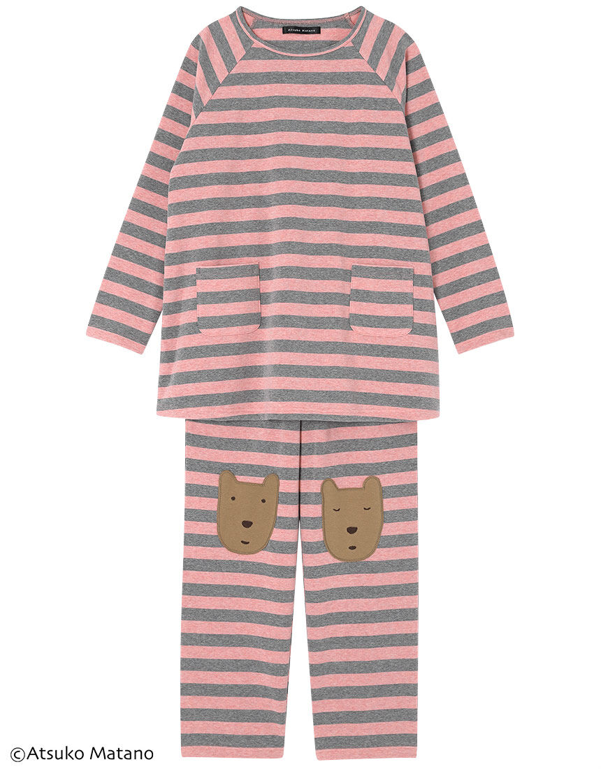【パジャマ(ロング袖ロングパンツ)】クリエーター"俣野温子"氏がデザインする、甘くなりすぎない大人かわいいテキスタイルとカラーで、くつろぎ時間を楽しく過ごせるパジャマ&ルームウェア肌側起毛であたたかい素材。太めのボーダー柄と、ひざについているかわいいくまのアップリケがポイント。【サイズ詳細】M:身幅53.5cm 着丈69.5cm 身丈72.5cm 裄丈75.0cm ボトム脇丈95.0cm 裾まわり43.0cm ウエスト58.0cm ヒップ100.5cm 股下(レングス)67.5cm L:身幅57.5cm 着丈69.5cm 身丈72.5cm 裄丈76.0cm ボトム脇丈95.5cm 裾まわり45.0cm ウエスト63.0cm ヒップ104.5cm 股下(レングス)67.5cm LL:身幅61.5cm 着丈70.5cm 身丈73.5cm 裄丈77.0cm ボトム脇丈96.0cm 裾まわり48.0cm ウエスト68.0cm ヒップ109.5cm 股下(レングス)67.5cm※出来上がり寸法を表示しております※サイズ詳細の寸法には多少の差異がございます出来上がり寸法の測り方についてはこちら※アイテムによって柄の出方が異なりますのでご了承ください。※メンズパジャマもございます。メンズパジャマはこちら表面フラッシュにご注意ください台所等で火を扱う場合には、表面の毛羽に引火することがありますので、十分にご注意ください。また、裏返して着用しないでください。「表面フラッシュとは」生地の表面毛羽に着火した火が、毛羽から毛羽へ、非常に早いスピードで、瞬時に火が走る現象です。パイル・タオル地や表面を起毛した素材で起こりやすく、綿やレーヨンなど植物せんい使用の素材にも、注意が必要です。これにより、火傷や火事になることも考えられます。炊事や暖房機具等の火には、十分ご注意ください。
