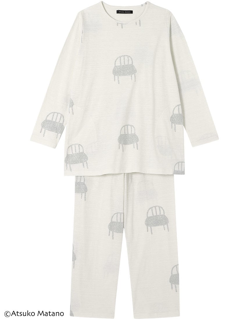 【パジャマ(ロング袖ロングパンツ)】クリエーター"俣野温子"氏がデザインする、甘くなりすぎない大人かわいいテキスタイルとカラーで、くつろぎ時間を楽しく過ごせるパジャマ&ルームウェア少しフシの見える生地感が特徴でやさしい肌ざわりの綿100%天竺素材。お昼寝がしたくなる大きい椅子をプリントで表現。【サイズ詳細】M:身幅53.5cm 着丈72.0cm 身丈74.5cm 肩幅39.0cm 袖丈56.5cm ボトム脇丈95.0cm 裾まわり43.0cm ウエスト58.0cm ヒップ100.5cm 股下(レングス)67.5cm L:身幅57.5cm 着丈72.0cm 身丈74.5cm 肩幅40.5cm 袖丈56.5cm ボトム脇丈95.5cm 裾まわり45.0cm ウエスト63.0cm ヒップ104.5cm 股下(レングス)67.5cm LL:身幅61.5cm 着丈73.0cm 身丈75.5cm 肩幅42.0cm 袖丈57.0cm ボトム脇丈96.0cm 裾まわり48.0cm ウエスト68.0cm ヒップ109.5cm 股下(レングス)67.5cm※出来上がり寸法を表示しております※サイズ詳細の寸法には多少の差異がございます出来上がり寸法の測り方についてはこちら※アイテムによって柄の出方が異なりますのでご了承ください。