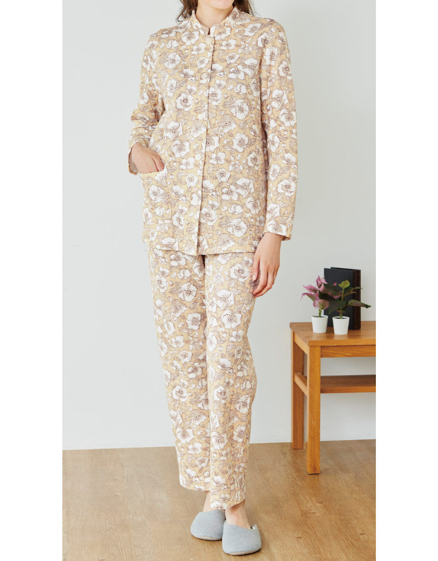 首もとをすっきり包む〈スタンドカラー〉が素敵な吸湿発熱であたたかい〈ニットキルト〉のパジャマ。両面ニット地に薄い中わたを入れた吸湿発熱性のある素材。大人感ある線描き風の花柄が上品でおしゃれな印象です。LOVE BODY 2023冬号 P67-1に掲載されています。