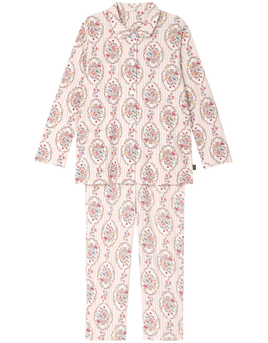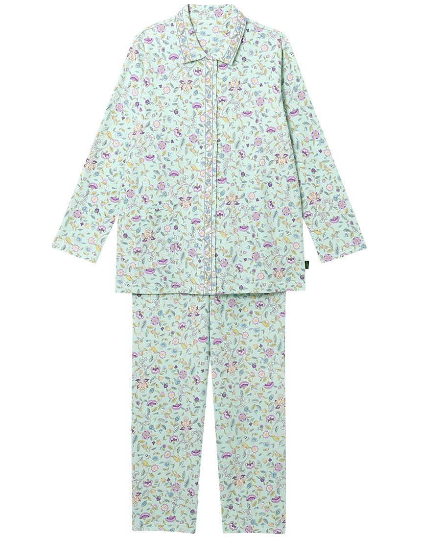 【パジャマ(ロング袖ロングパンツ)】1793年に誕生以来、代表される「ハドンホール」柄を始め、多くのコレクションを世に送り出し続けている「ミントン」。その気品あふれる美しい柄を使用したパジャマ。〈ハドンホール〉*柄とブレードリボンのような片耳飾りを組み合わせたデザイン。定番的な総柄にすっきりとしたリボンテープのアクセントが新鮮。ループが8の字を描くように編まれ、空気を含みやすくあたたかなエイトロック素材。表起毛加工をほどこし、よりふんわりした風合いに。*1948年にデザインされ、発売以来、世界中で愛されているロングセラーの図柄。パッションフラワー、パンジー、カーネーションなどが図案化され、東洋的なエキゾチシズムが感じられるデザイン。[資料元:(株)川島織物セルコン]【サイズ詳細】M:身幅52.0cm 着丈67.0cm 身丈69.5cm 肩幅40.0cm 袖丈55.0cm ボトム脇丈95.0cm 裾まわり39.0cm ウエスト58.0cm ヒップ100.5cm 股下(レングス)67.5cm L:身幅56.0cm 着丈67.0cm 身丈69.5cm 肩幅41.5cm 袖丈55.0cm ボトム脇丈95.5cm 裾まわり41.0cm ウエスト63.0cm ヒップ104.5cm 股下(レングス)67.0cm※出来上がり寸法を表示しております※サイズ詳細の寸法には多少の差異がございます出来上がり寸法の測り方についてはこちら※アイテムによって柄の出方が異なりますのでご了承ください。表面フラッシュにご注意ください台所等で火を扱う場合には、表面の毛羽に引火することがありますので、十分にご注意ください。また、裏返して着用しないでください。「表面フラッシュとは」生地の表面毛羽に着火した火が、毛羽から毛羽へ、非常に早いスピードで、瞬時に火が走る現象です。パイル・タオル地や表面を起毛した素材で起こりやすく、綿やレーヨンなど植物せんい使用の素材にも、注意が必要です。これにより、火傷や火事になることも考えられます。炊事や暖房機具等の火には、十分ご注意ください。