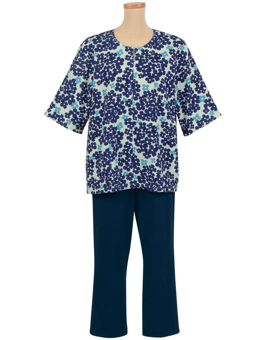 【六分袖・ボトムロング丈】トップスは、夏にここちよい凹凸のある肌ばなれのよい素材。つまみやすい前ファスナー付き。ボトムは無地のニット素材。※トップス前ポケット付き※ウエストゴム替え口あり、ボトム裾ゴム通し口あり同柄・同素材のワンピースタイプ(DNL035)もございます。【サイズ詳細】※身長146cm?154cmに対応しています。SP:バスト100.0cm、着丈63.5cm、ズボン脇丈89.5cm、ウエスト60.0cm MP:バスト108.0cm、着丈63.5cm、ズボン脇丈90.5cm、ウエスト65.0cm LP:バスト116.0cm、着丈63.5cm、ズボン脇丈91.5cm、ウエスト71.0cm LLP:バスト124.0cm、着丈63.5cm、ズボン脇丈92.5cm、ウエスト77.0cm※でき上がり寸法を表示しています。※サイズ詳細の寸法には多少の差異がございます。出来上がり寸法の測り方についてはこちら
