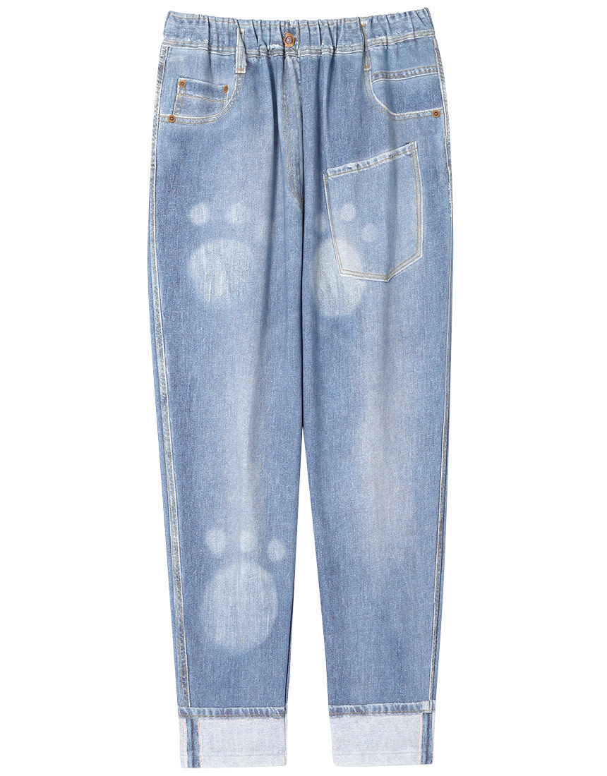 【ボトムス(ロングパンツ)】毎日をもっと楽しく過ごせるように。嬉しいとき。不安なとき。ひとりのとき。家族といるとき。どんなときでもHAPPYなものを身につけて、笑顔になってもらいたい。デザイナー"津森千里"氏のそんな気持ちを表現したブランド。・ミニ裏毛素材・好評のデニム風のプリントをした股上がゆったりしたサルエルパンツ。両脇にスラッシュポケット付き【サイズ詳細】M:ボトム脇丈93.5cm 裾まわり27.5cm ウエスト64.0cm ヒップ102.0cm 股下(レングス)61.5cm L:ボトム脇丈94.5cm 裾まわり29.5cm ウエスト68.0cm ヒップ106.0cm 股下(レングス)61.5cm※出来上がり寸法を表示しております※サイズ詳細の寸法には多少の差異がございます出来上がり寸法の測り方についてはこちら※アイテムによって柄の出方が異なりますのでご了承ください。表面フラッシュにご注意ください台所等で火を扱う場合には、表面の毛羽に引火することがありますので、十分にご注意ください。また、裏返して着用しないでください。「表面フラッシュとは」生地の表面毛羽に着火した火が、毛羽から毛羽へ、非常に早いスピードで、瞬時に火が走る現象です。パイル・タオル地や表面を起毛した素材で起こりやすく、綿やレーヨンなど植物せんい使用の素材にも、注意が必要です。これにより、火傷や火事になることも考えられます。炊事や暖房機具等の火には、十分ご注意ください。