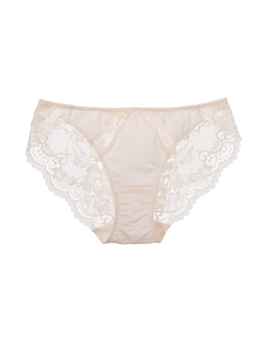 【フロント】・なめらかなストレッチ生地で、逆V字型にあしらったレースがポイント。レース部は裏打ちなしで肌が透ける。【バック】・ふっくらと厚みのある柄行きで華やかなストレッチレースを全面に使用。・脚ぐりにゴム不使用で、肌あたりがやさしい。【はき込み】・レギュラー(ふつう)